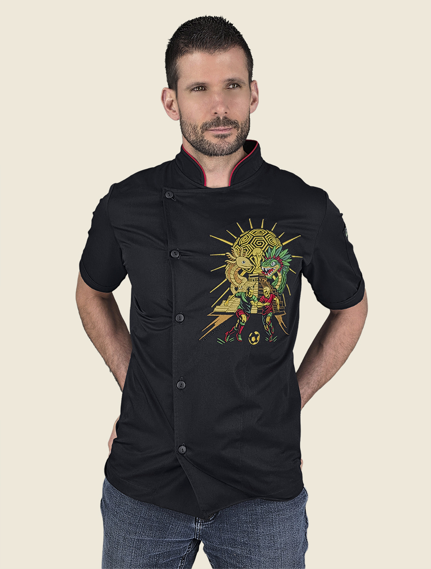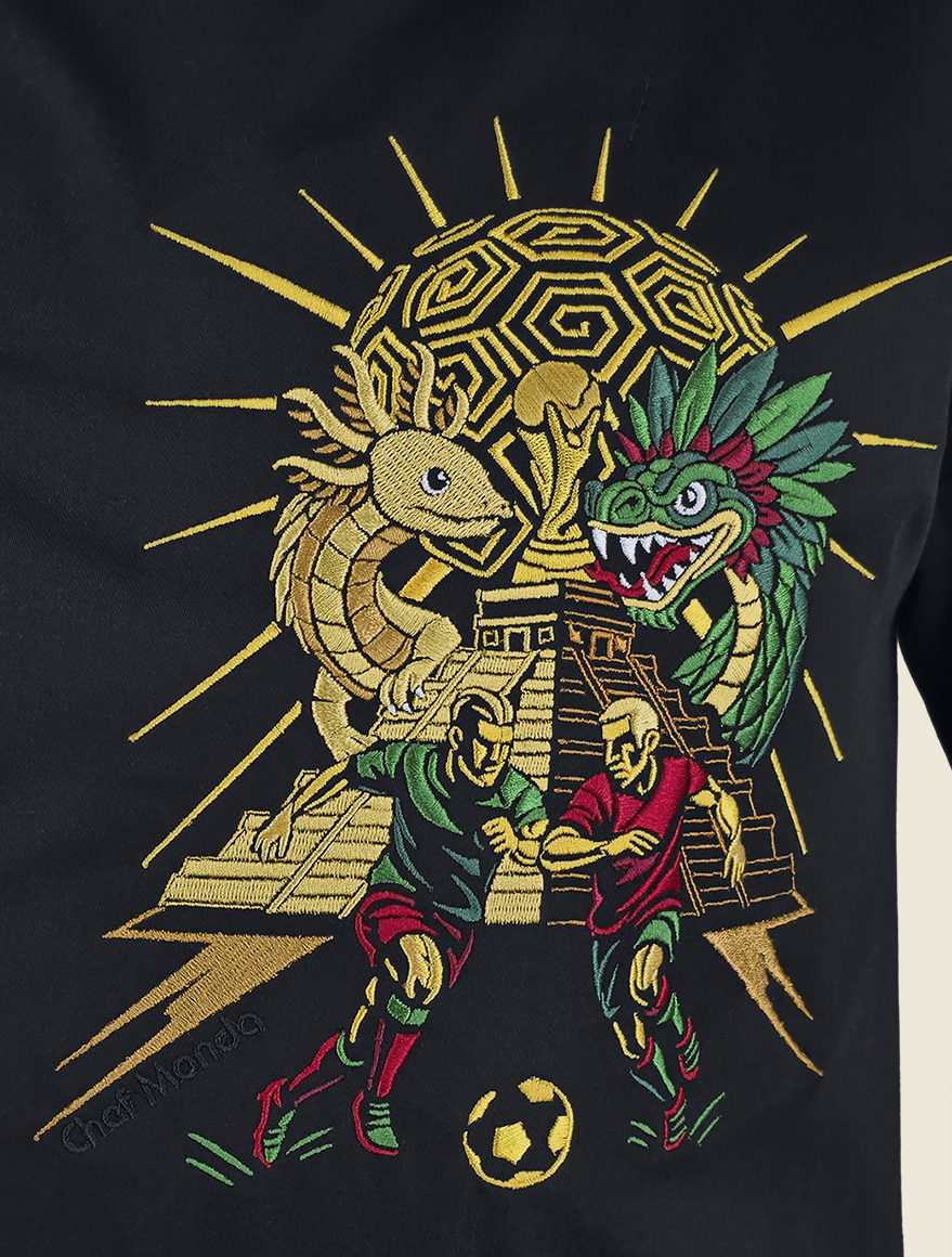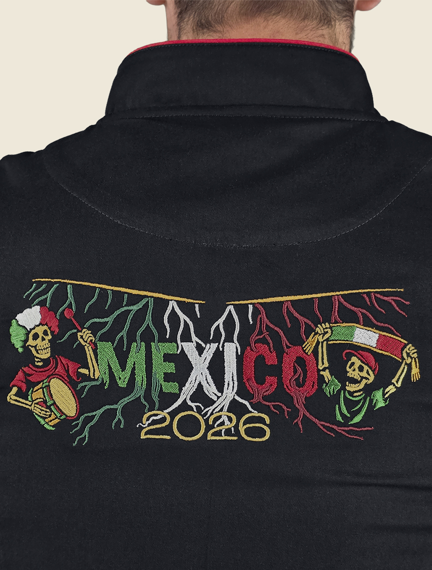 Decoran esta prenda dos hermosos bordados: en el delantero izquierdo y la parte superior de la espalda, de esmeradas puntadas, que nace de la fusión entre mito y folklore, donde dialogan lucha futbolística, fauna y festividades mexicanas.