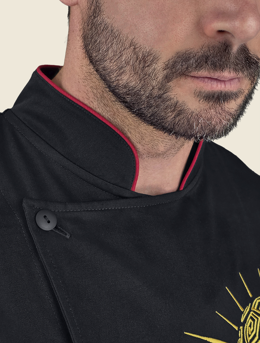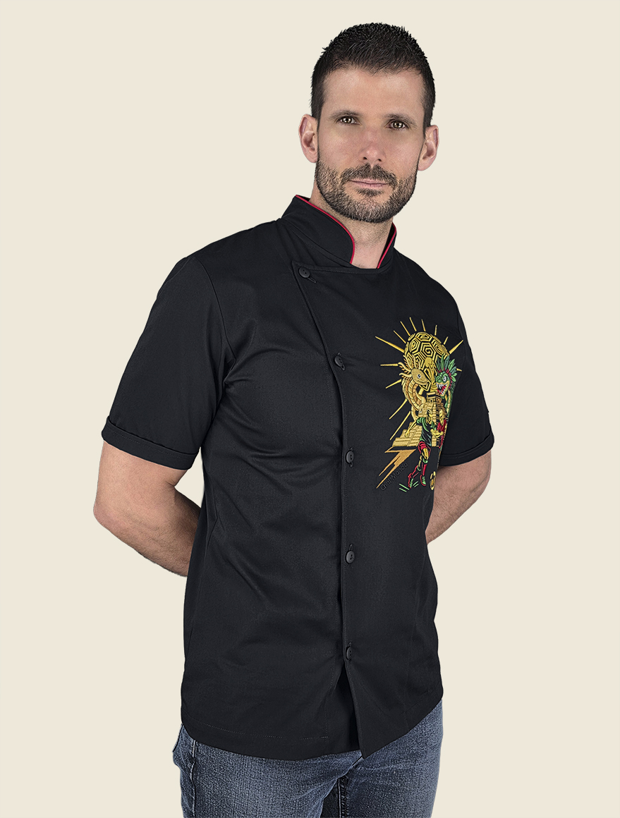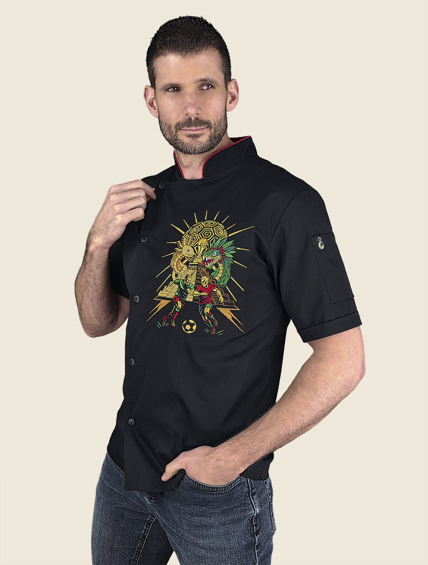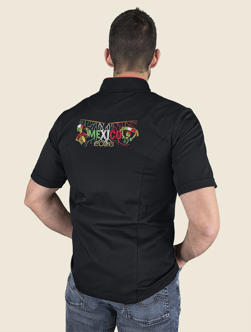 Decoran esta prenda dos hermosos bordados: en el delantero izquierdo y la parte superior de la espalda, de esmeradas puntadas, que nace de la fusión entre mito y folklore, donde dialogan lucha futbolística, fauna y festividades mexicanas.