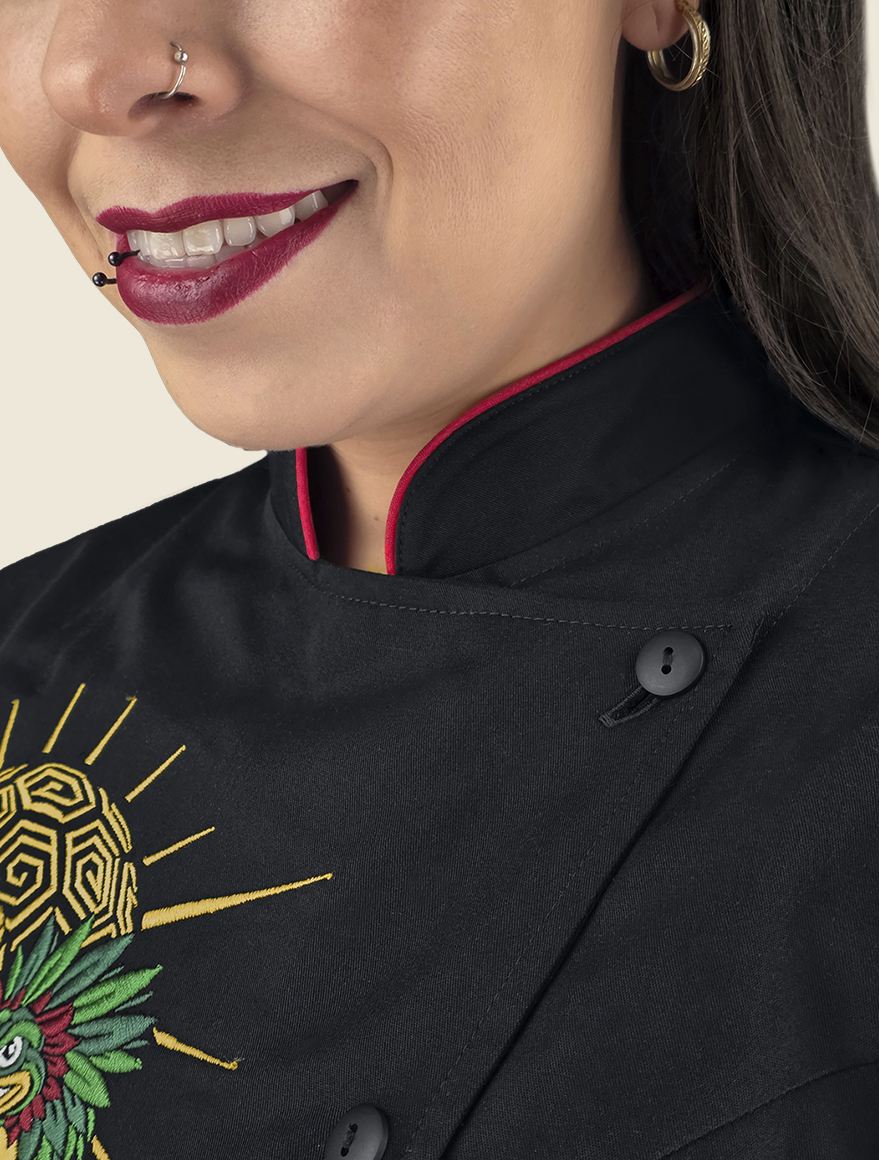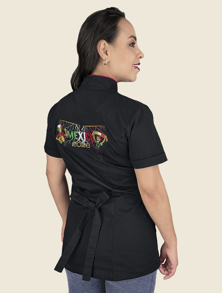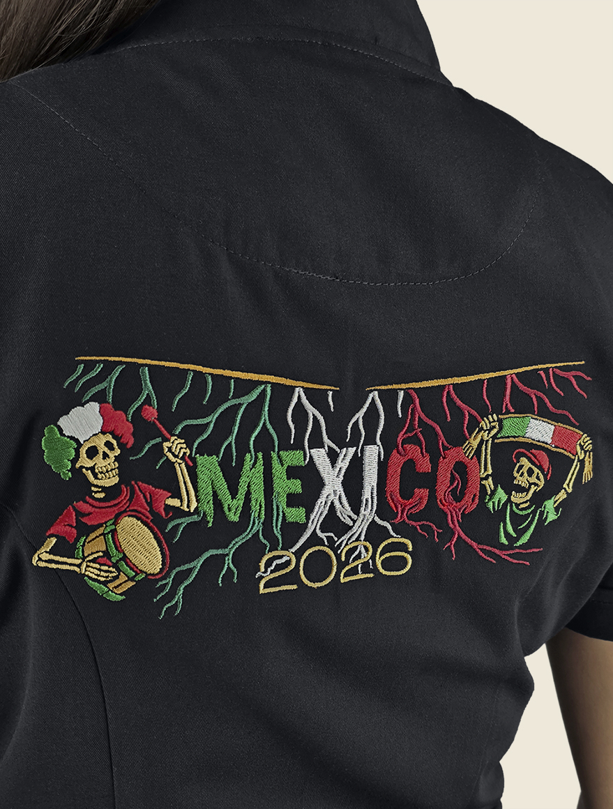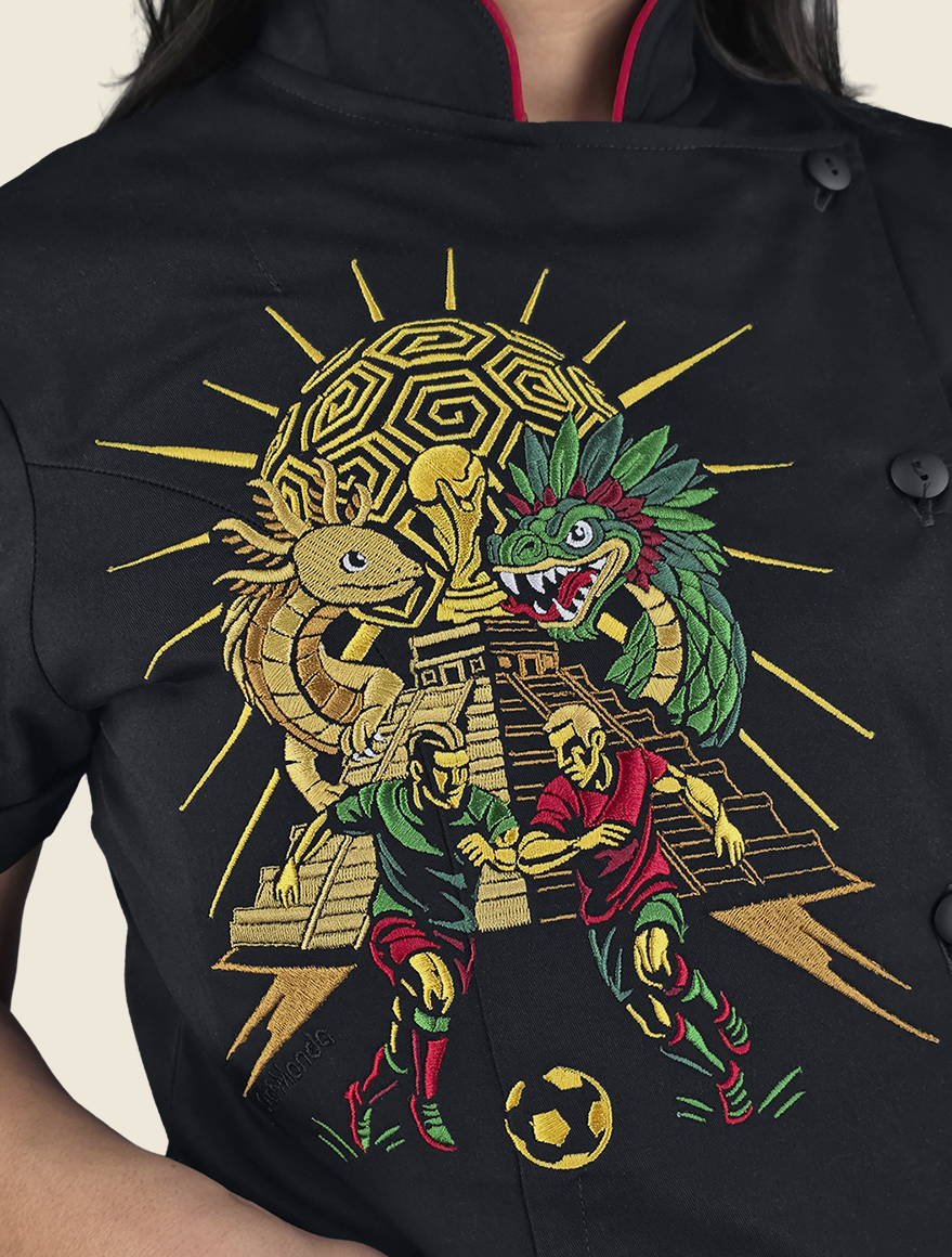 Decoran esta prenda dos hermosos bordados: en el delantero izquierdo y la parte superior de la espalda, de esmeradas puntadas, que nace de la fusión entre mito y folklore, donde dialogan lucha futbolística, fauna y festividades mexicanas.