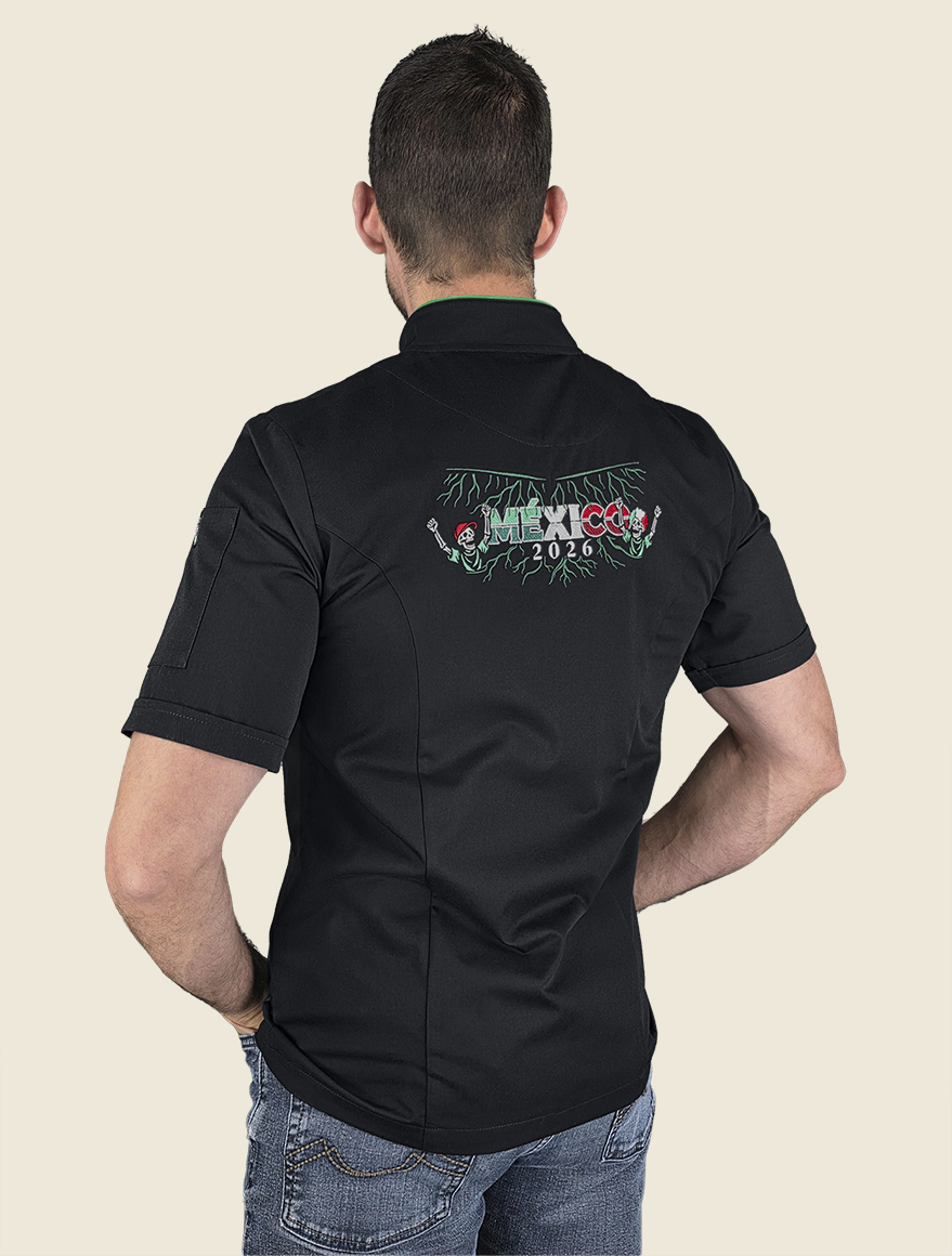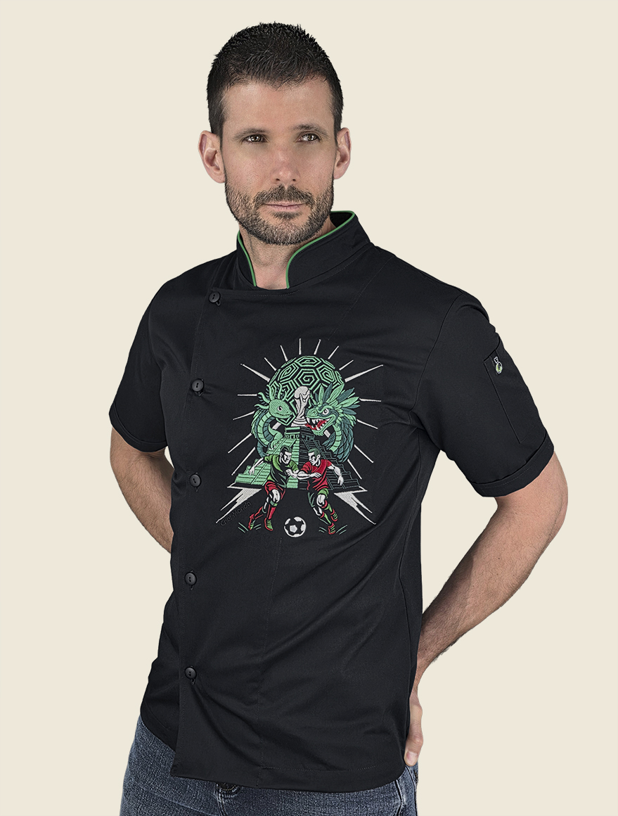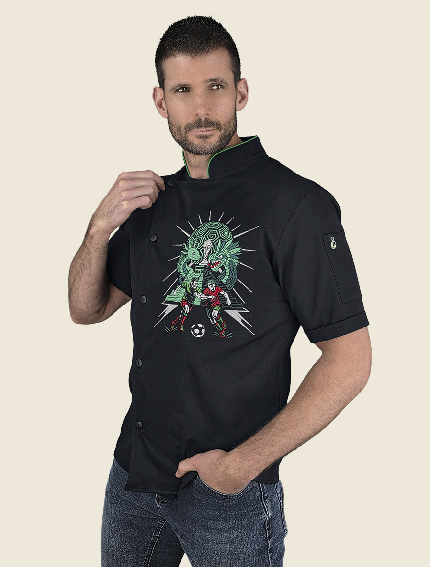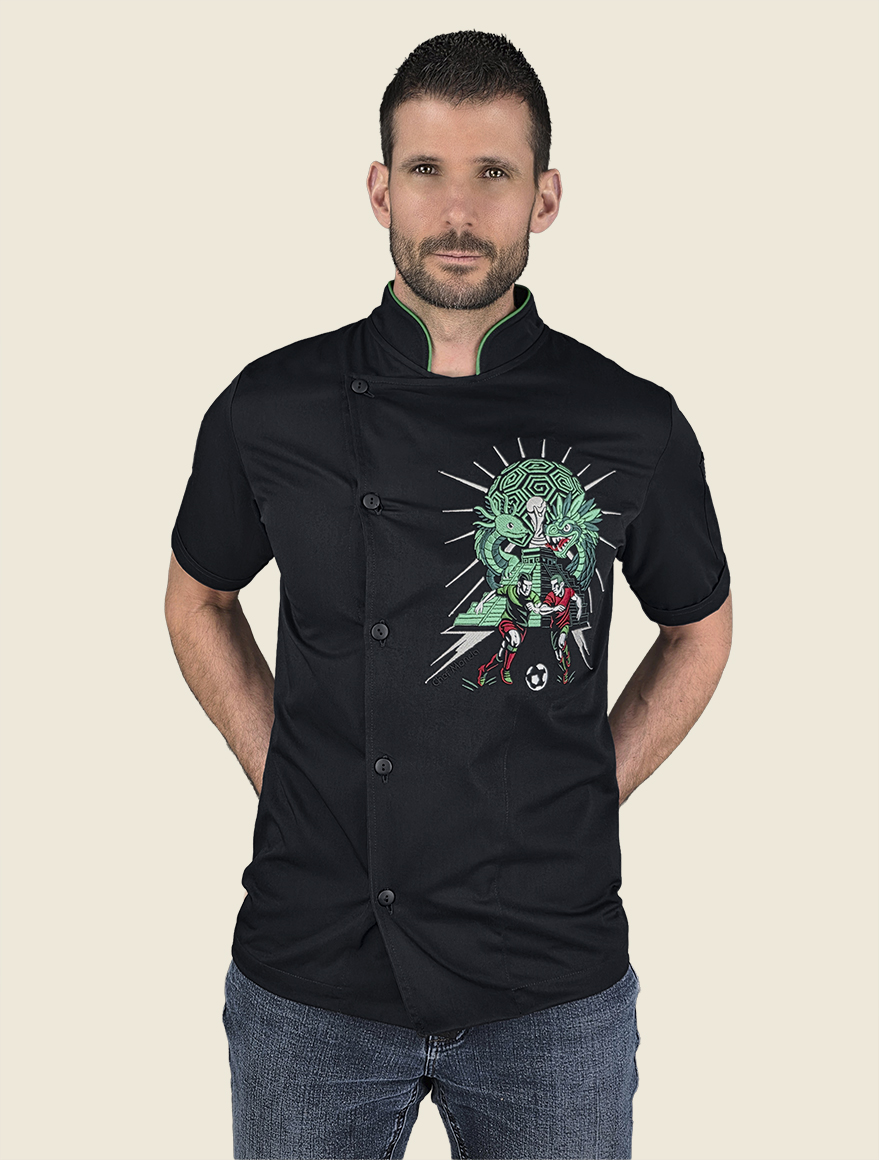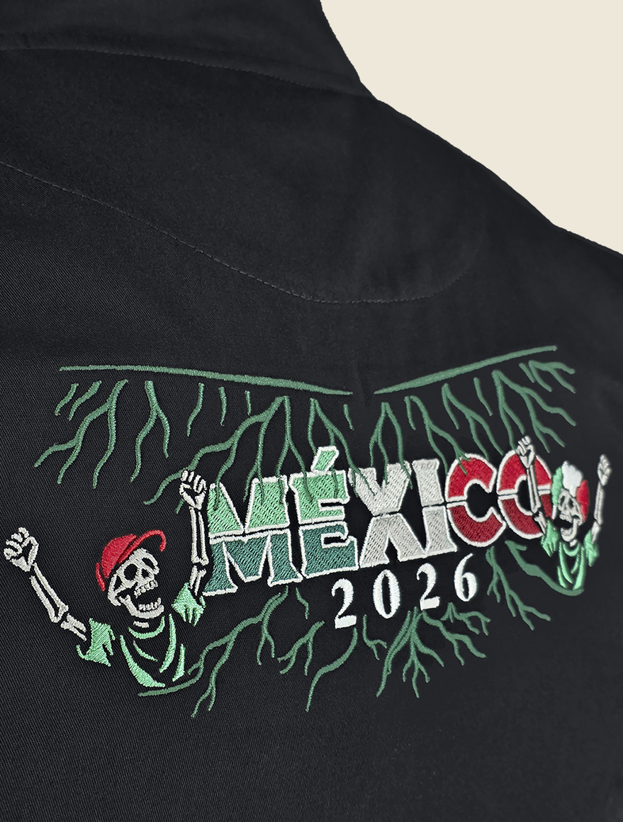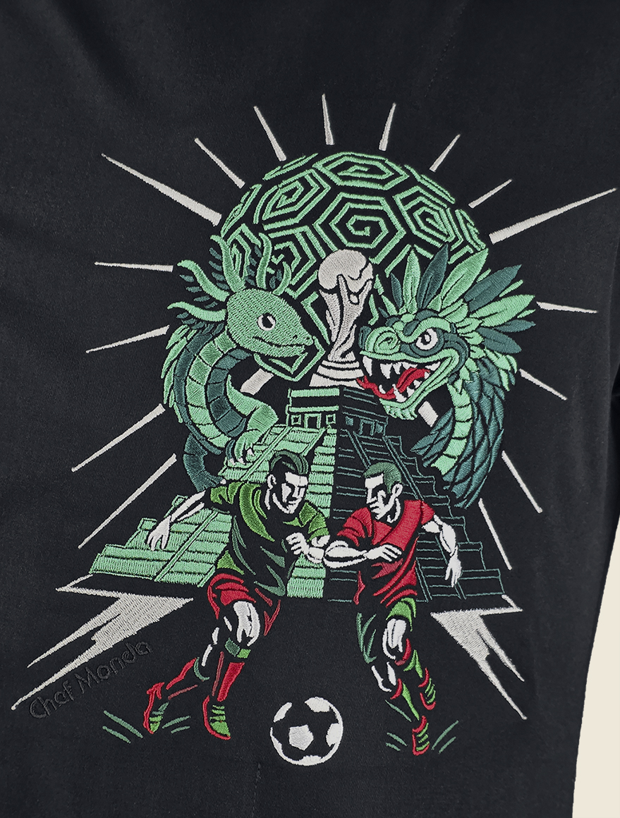 Decoran esta prenda dos hermosos bordados: en el delantero izquierdo y la parte superior de la espalda, de esmeradas puntadas, que nace de la fusión entre mito y folklore, donde dialogan lucha futbolística, fauna y festividades mexicanas.