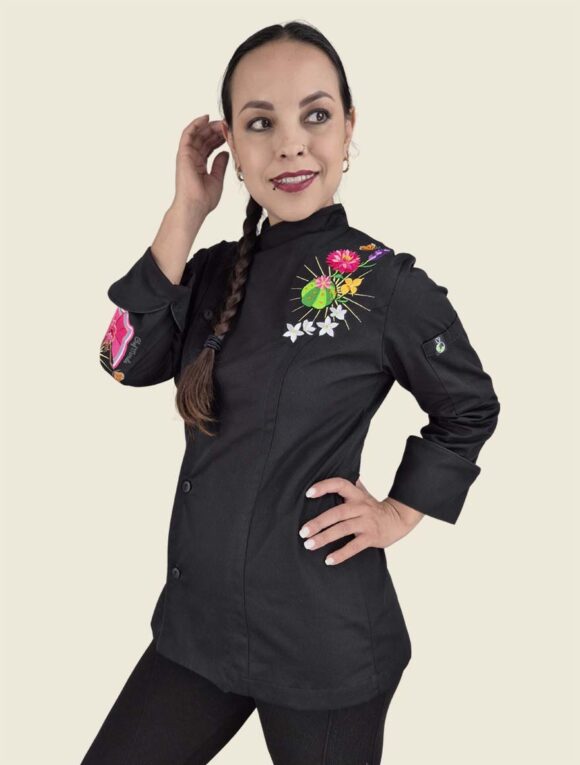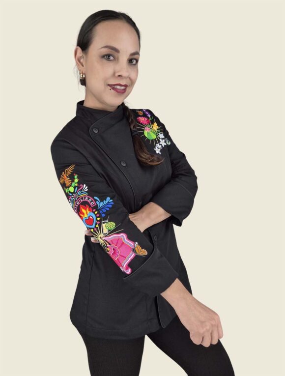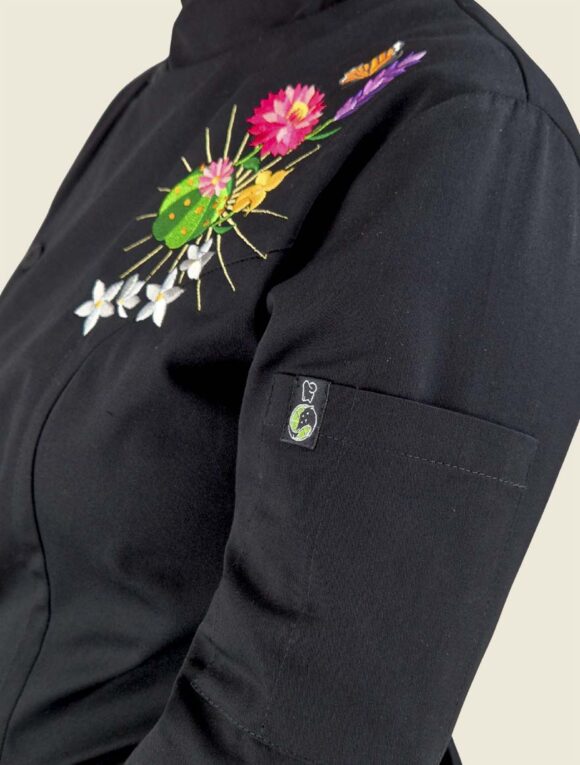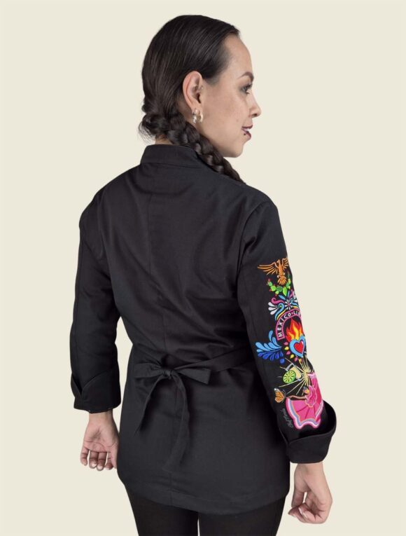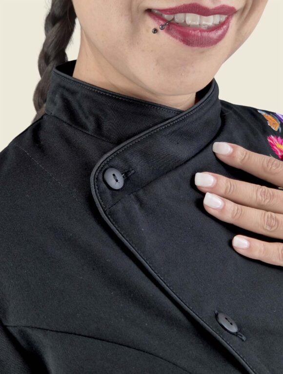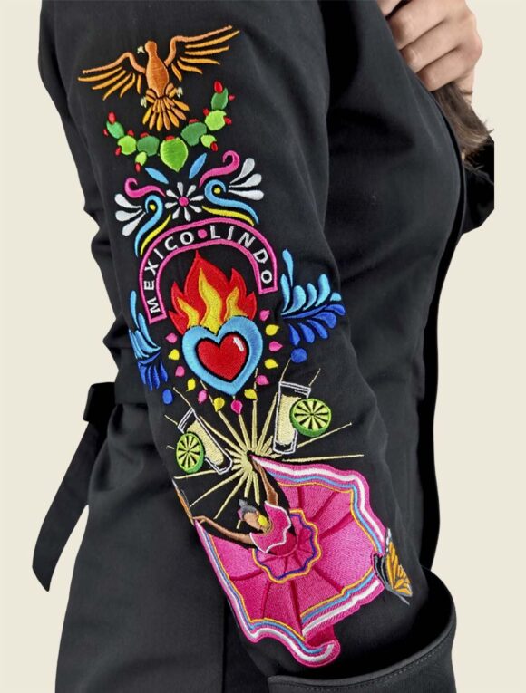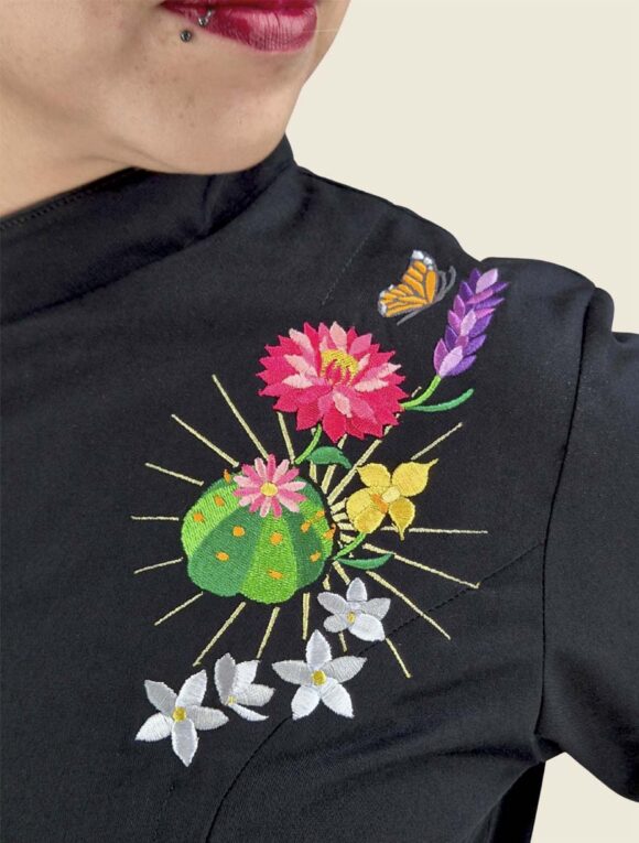 Decoran la prenda dos hermosos bordados, de perfectas puntadas llenas de colores vibrantes y alegres, inspirados en elementos icónicos del folklore y la flora mexicanos.
