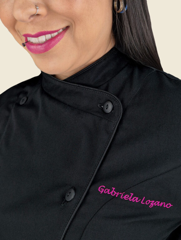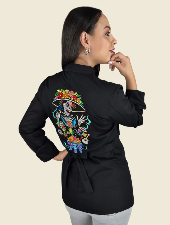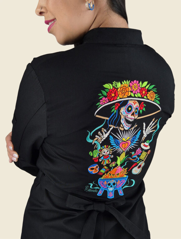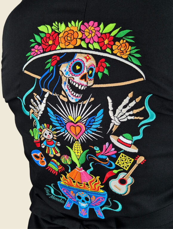 Decora la prenda un impactante bordado ubicado en la espalda inspirado en el tradicional Día de Muertos y otros elementos icónicos de la cultura y folklore mexicanos.