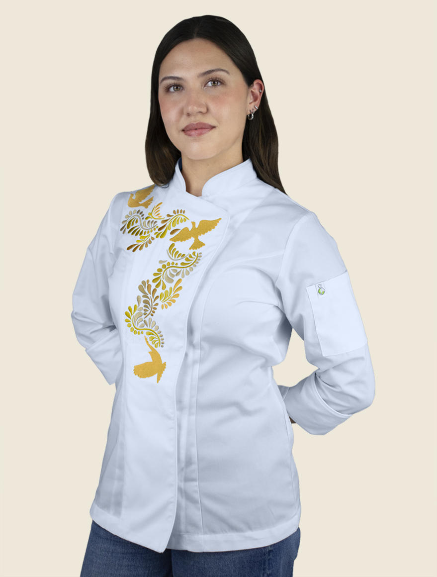 Decora la prenda un hermoso bordado de perfectas puntadas en tonos oro, inspirado en la tradicional cerámica de Talavera poblana, ubicado en el delantero izquierdo.
