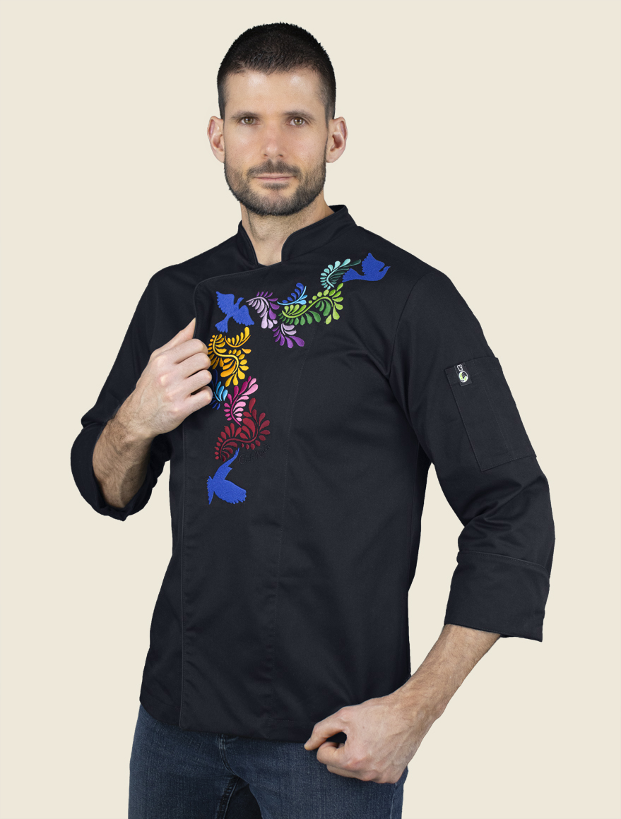 Decora la prenda un hermoso bordado de perfectas puntadas en colores vibrantes, inspirado en la tradicional cerámica de Talavera poblana, ubicado en el delantero izquierdo.