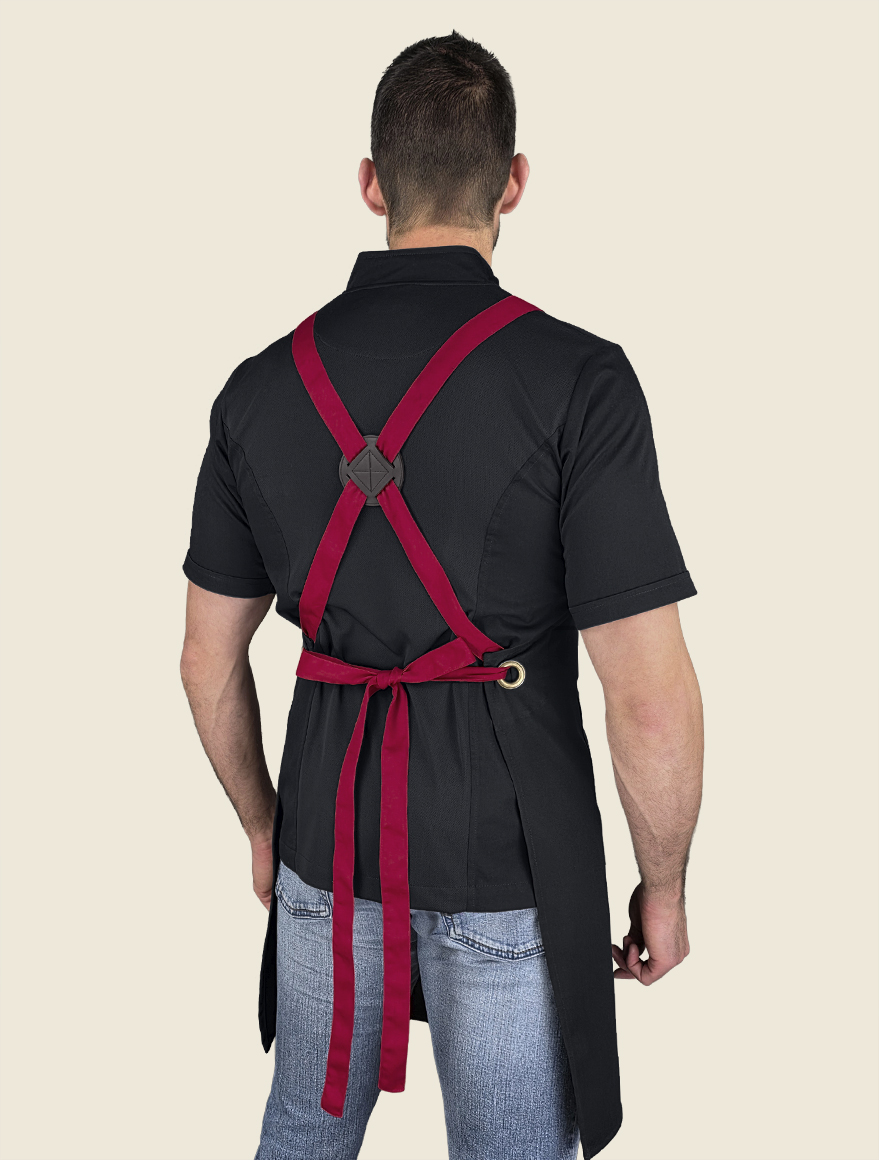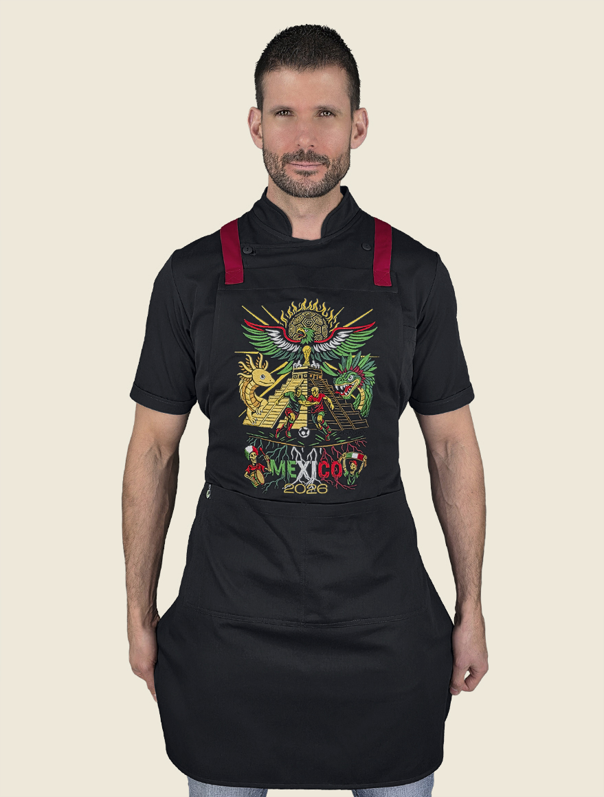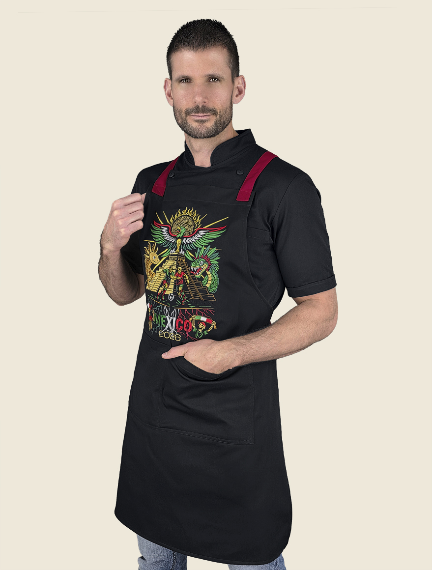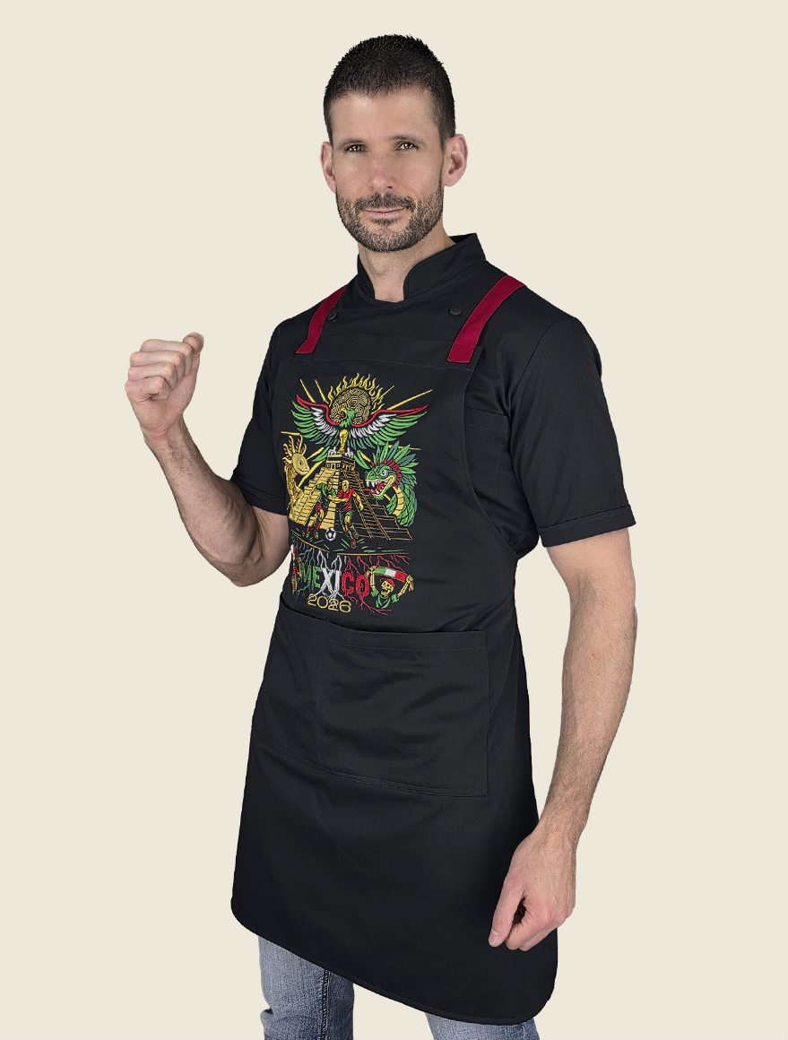 Elegante mandil de peto, 100% mexicano, con cintas ajustables cruzadas en la espalda a través de cómodo conector en “x” de vinipiel. Cuenta con dos prácticas bolsas tipo parche, centradas al frente , a la altura de la cadera.