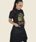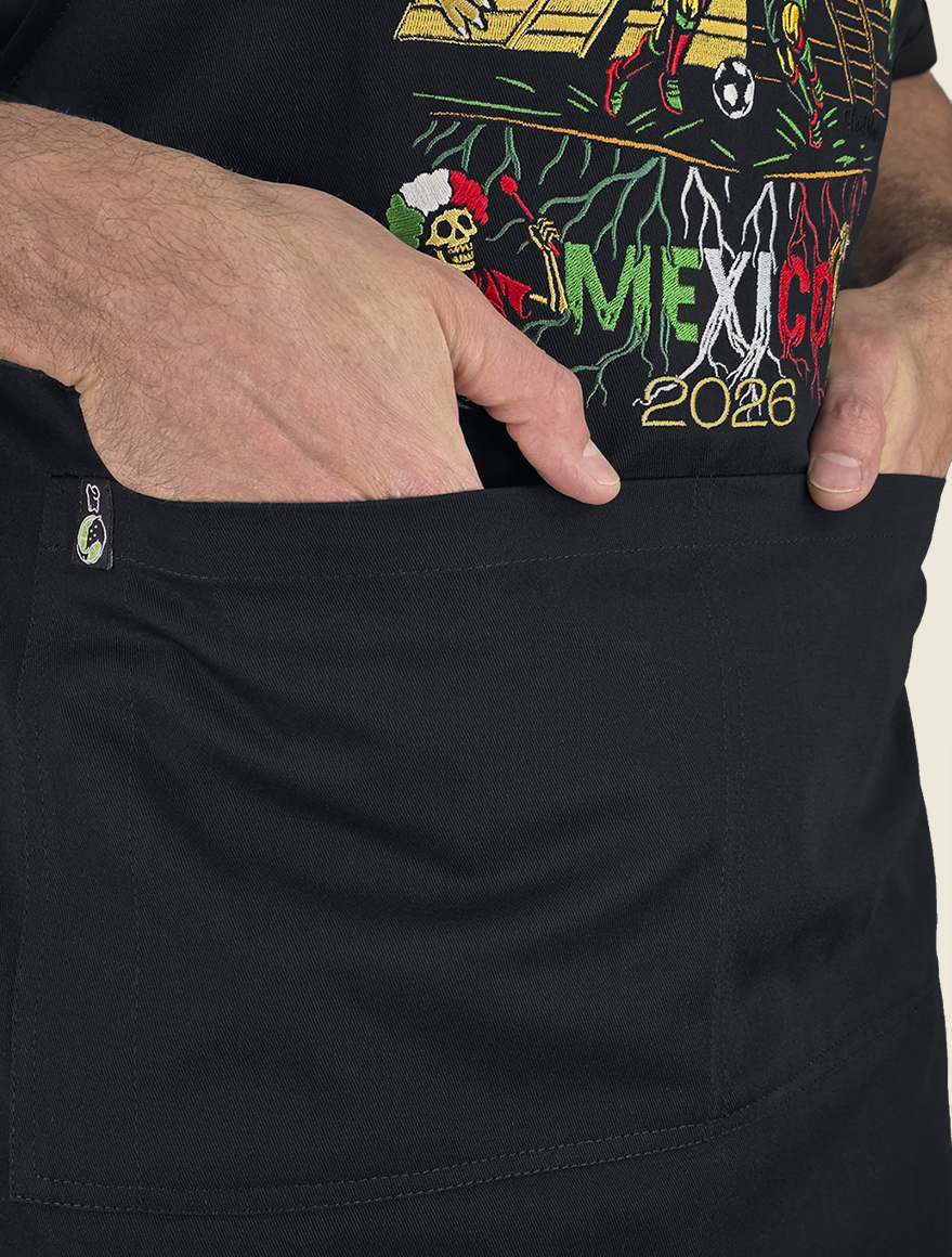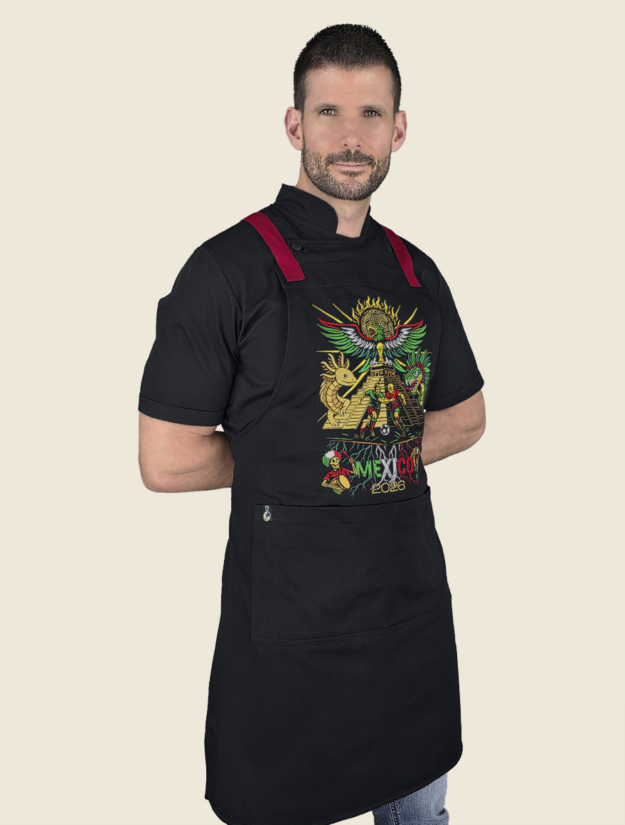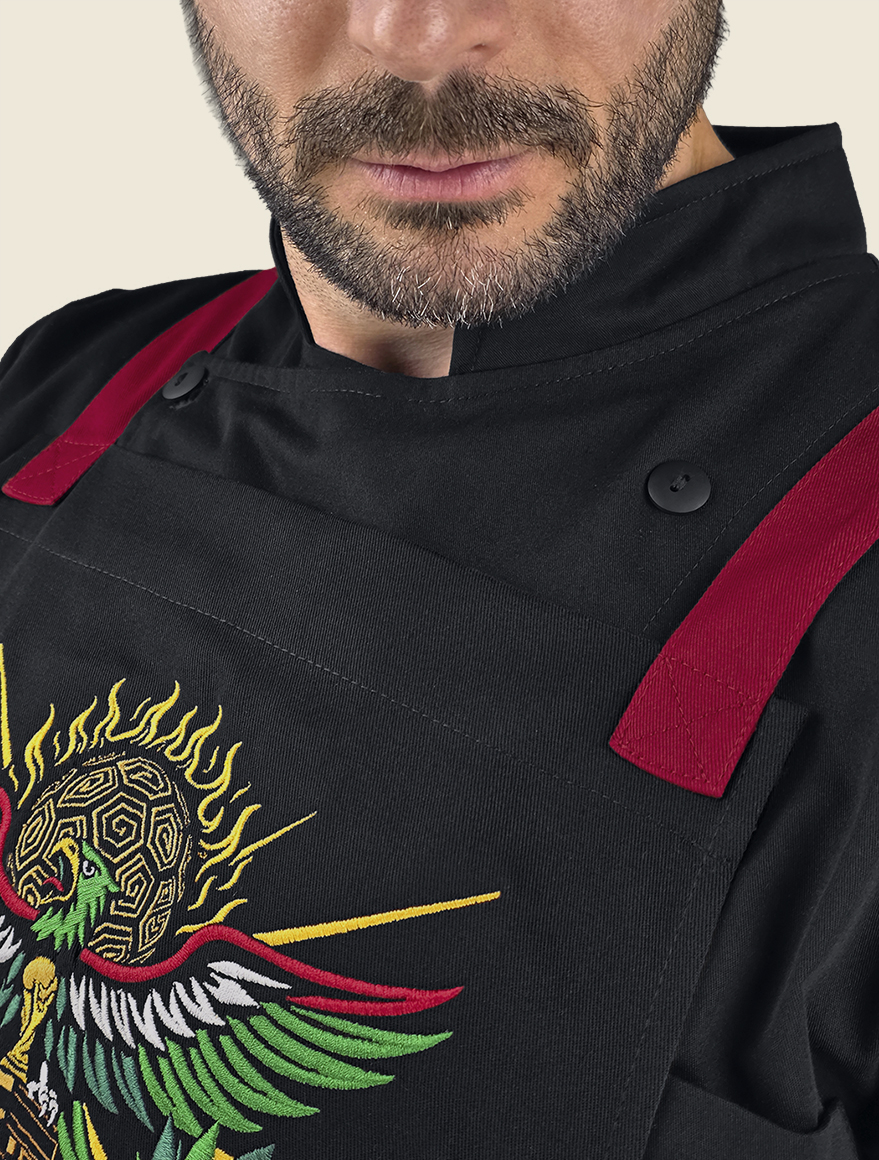 Elegante mandil de peto, 100% mexicano, con cintas ajustables cruzadas en la espalda a través de cómodo conector en “x” de vinipiel. Cuenta con dos prácticas bolsas tipo parche, centradas al frente , a la altura de la cadera.