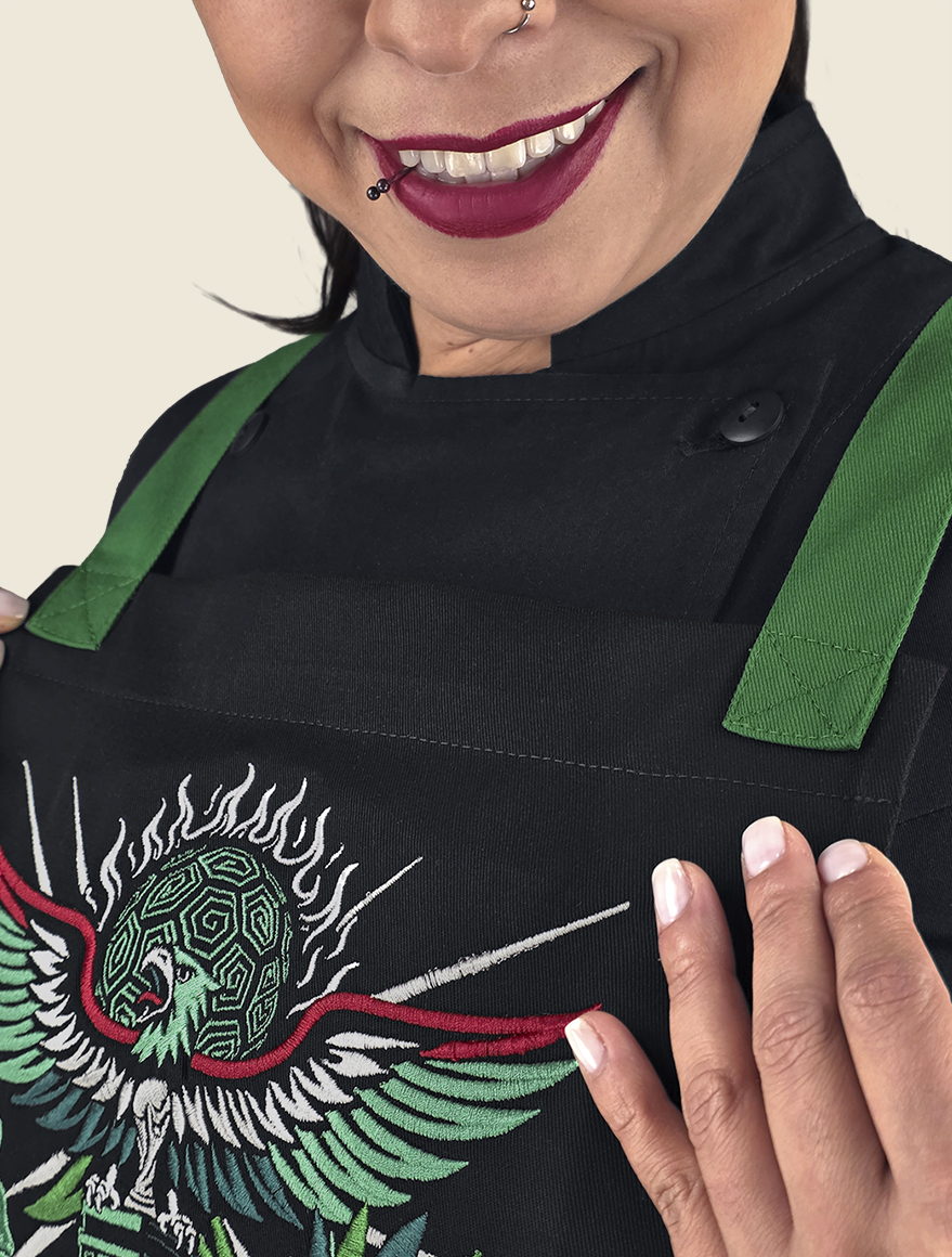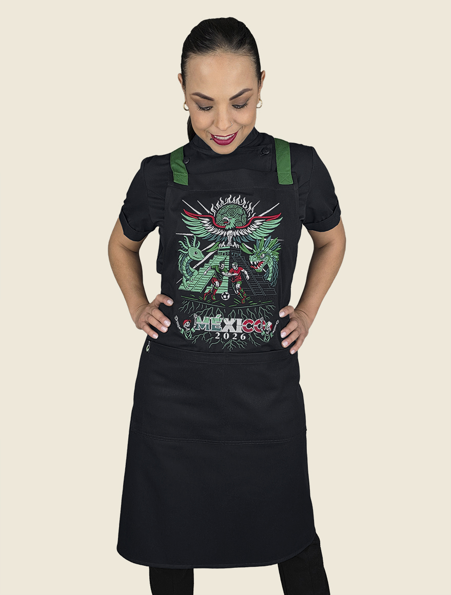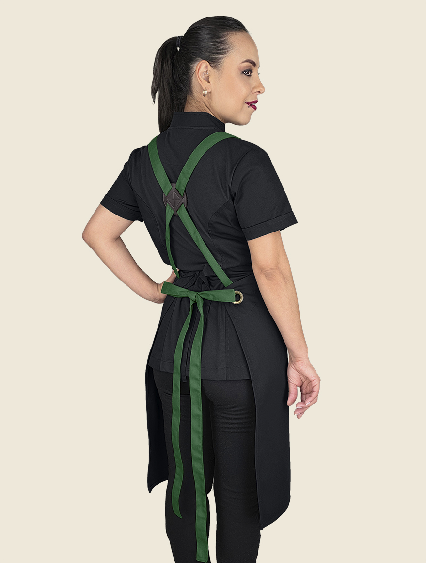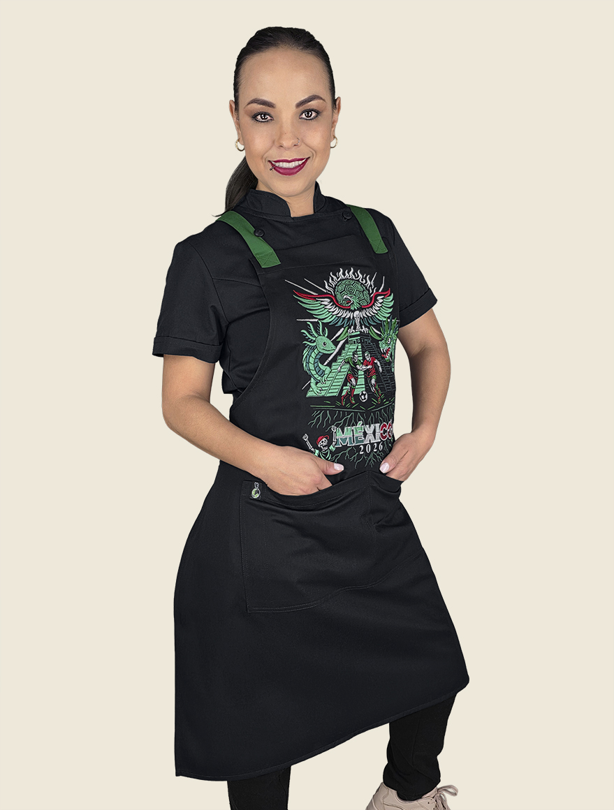 Elegante mandil de peto, 100% mexicano, con cintas ajustables cruzadas en la espalda a través de cómodo conector en “x” de vinipiel. Cuenta con dos prácticas bolsas tipo parche, centradas al frente , a la altura de la cadera.