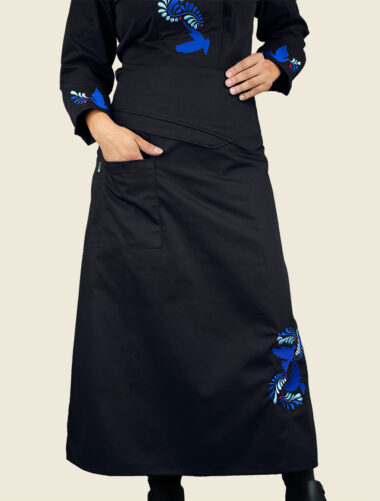Elegante mandil de peto, 100% mexicano, con cintas ajustables cruzadas en la espalda a través de cómodo conector en “x” de vinipiel. Éstas se unen mediante elementos decorativos de vinipiel remachados a bandolas metálicas color oro viejo, conectadas a su vez al mandil a través de ojillos. Cuenta con dos prácticas bolsas tipo parche, centradas al frente , a la altura de la cadera.