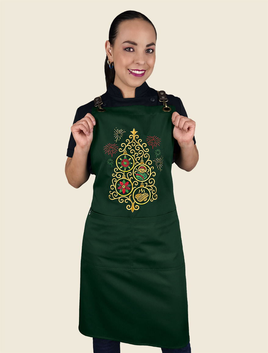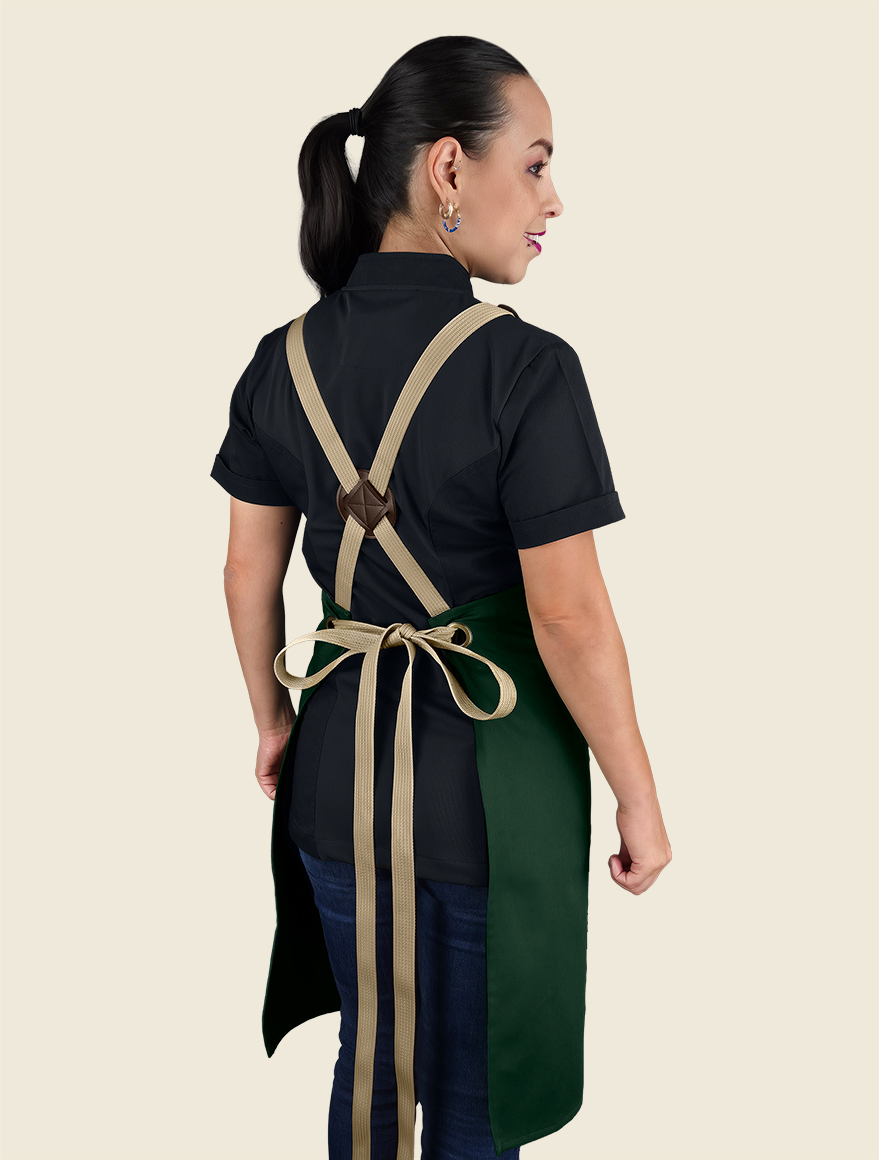 Elegante mandil de peto, 100% mexicano, con cintas ajustables cruzadas en la espalda a través de cómodo conector en “x” de vinipiel. Éstas se unen mediante elementos decorativos de vinipiel remachados a bandolas metálicas color oro viejo, conectadas a su vez al mandil a través de ojillos. Cuenta con dos prácticas bolsas tipo parche, centradas al frente , a la altura de la cadera.