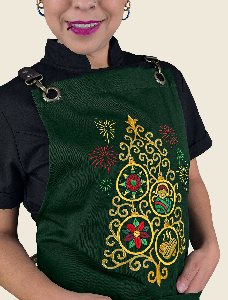 Decora esta prenda un hermoso bordado en el centro del pecho, de esmeradas puntadas, inspirado en la tradición navideña mexicana.