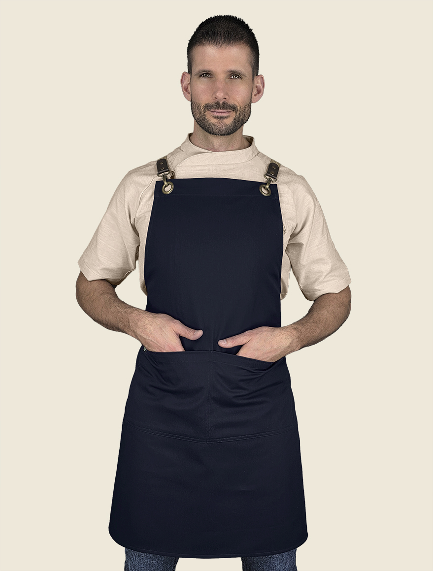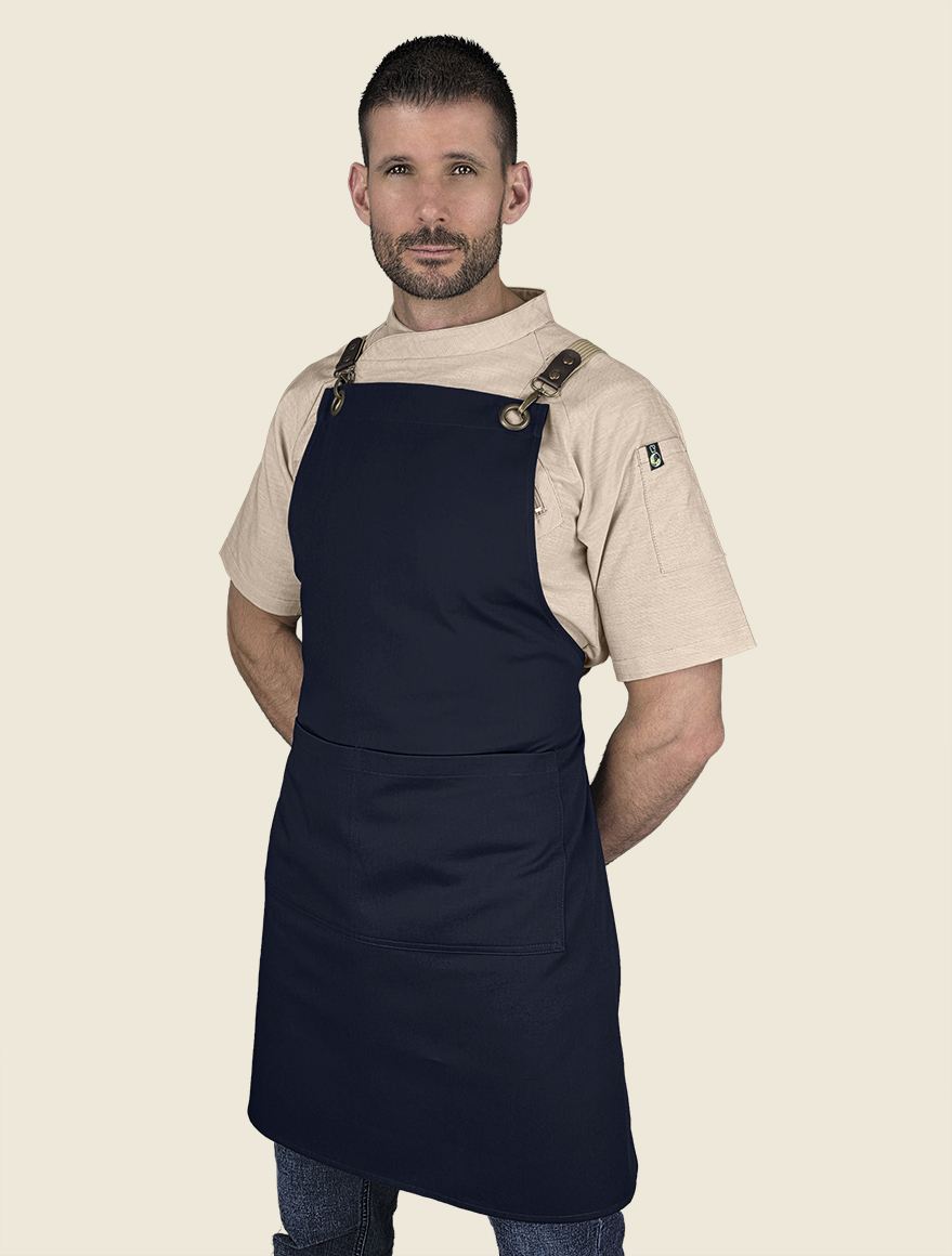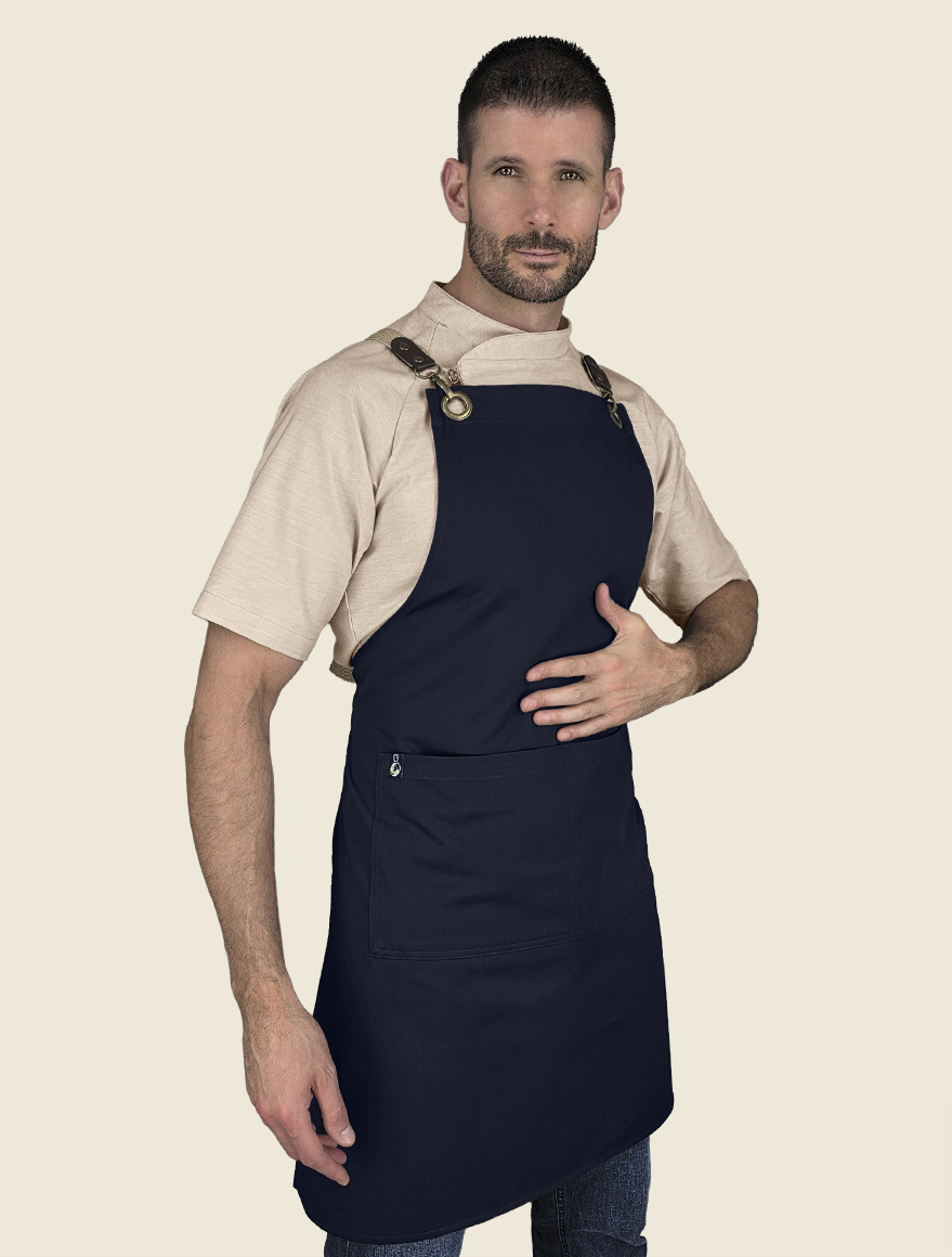 Elegante mandil de peto, 100% mexicano, con cintas ajustables cruzadas en la espalda a través de cómodo conector en “x” de vinipiel. Éstas se unen mediante elementos decorativos de vinipiel remachados a bandolas metálicas color oro viejo, conectadas a su vez al mandil a través de ojillos. Cuenta con dos prácticas bolsas tipo parche, centradas al frente, a la altura de la cadera.