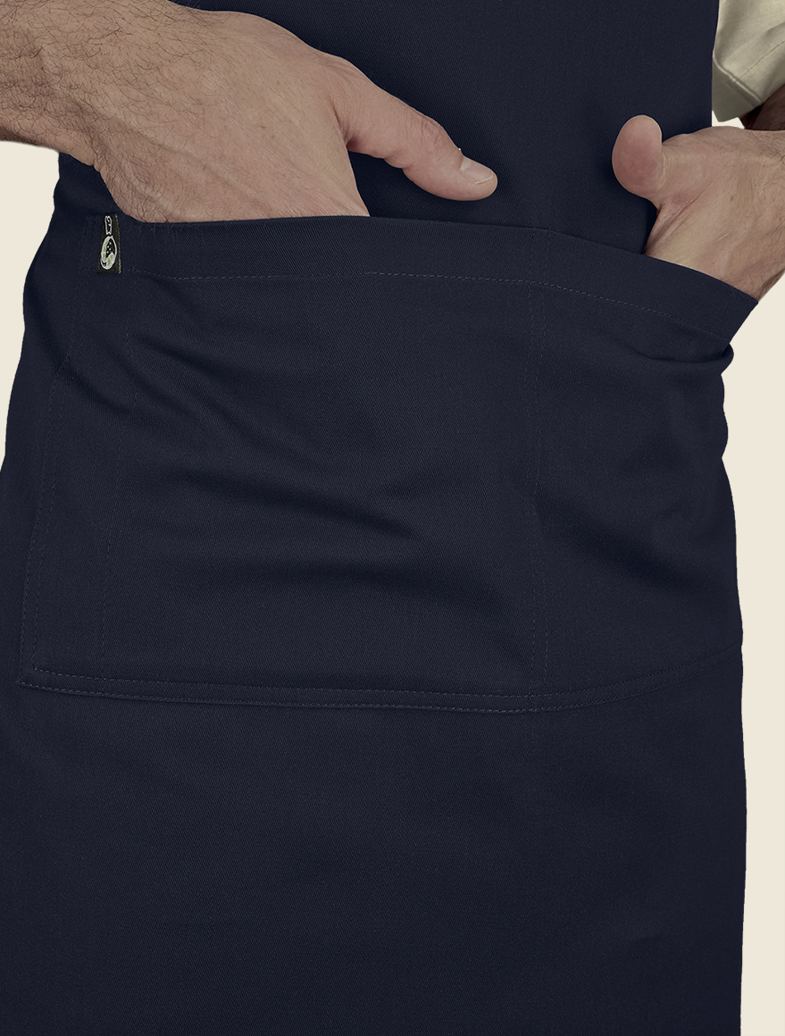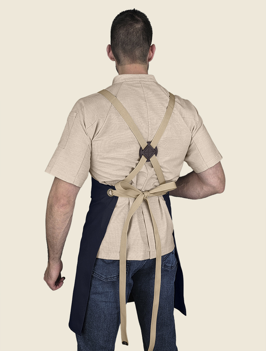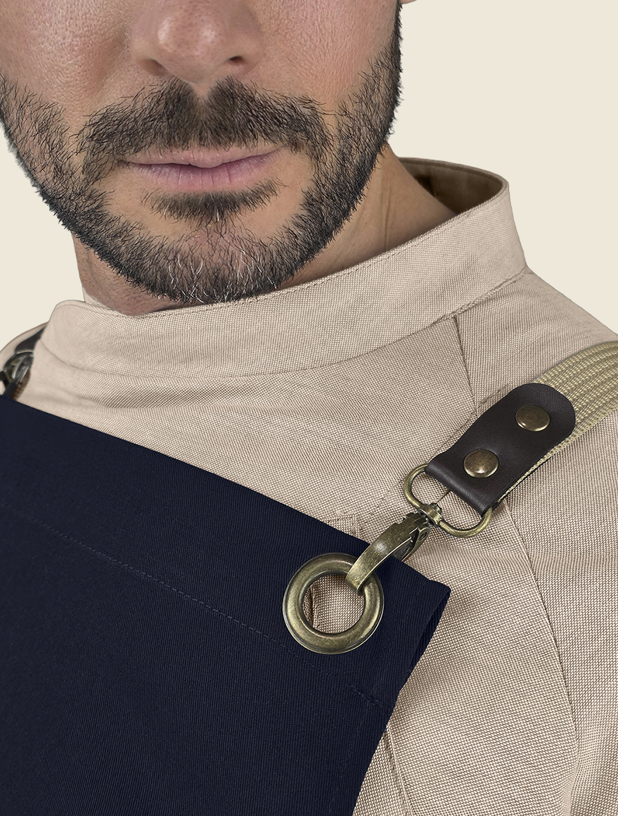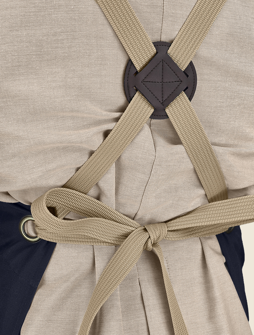 Elegante mandil de peto, 100% mexicano, con cintas ajustables cruzadas en la espalda a través de cómodo conector en “x” de vinipiel. Éstas se unen mediante elementos decorativos de vinipiel remachados a bandolas metálicas color oro viejo, conectadas a su vez al mandil a través de ojillos. Cuenta con dos prácticas bolsas tipo parche, centradas al frente, a la altura de la cadera.