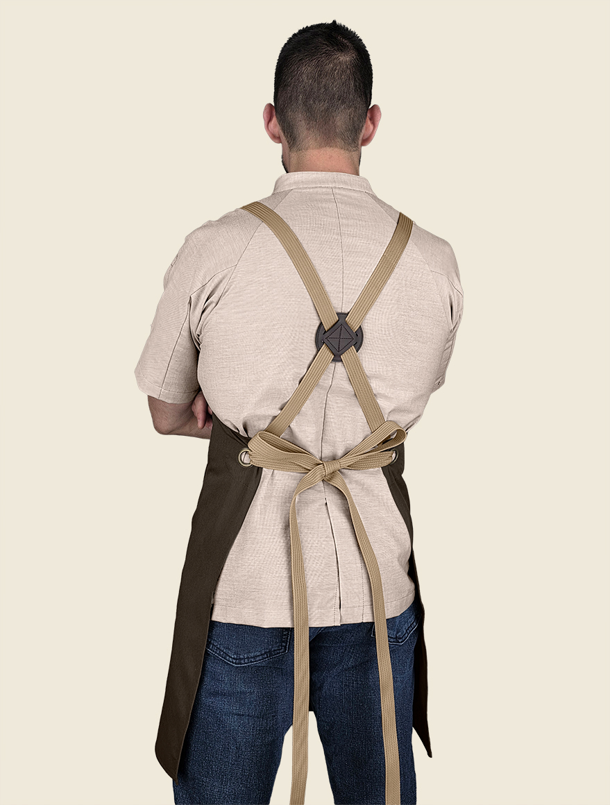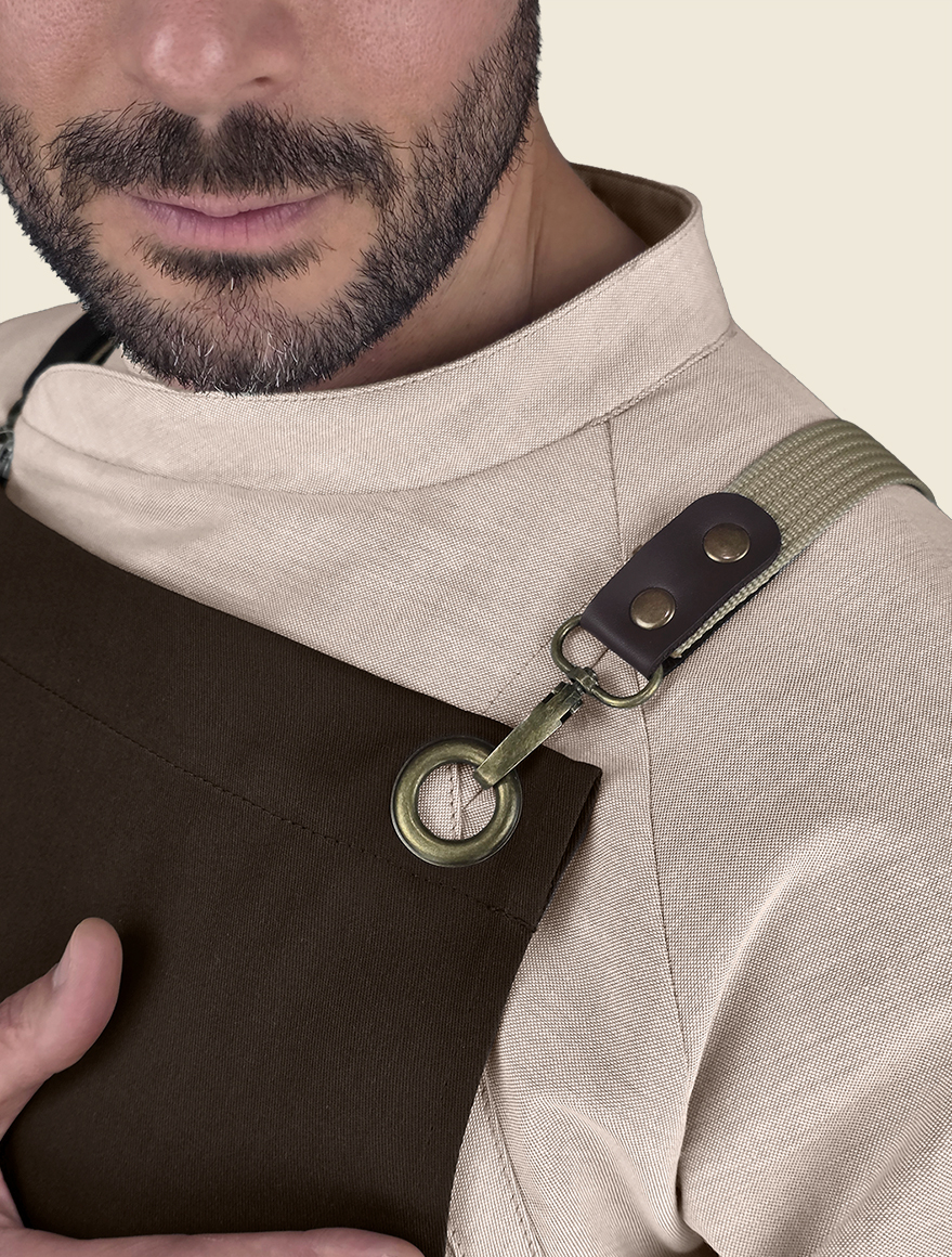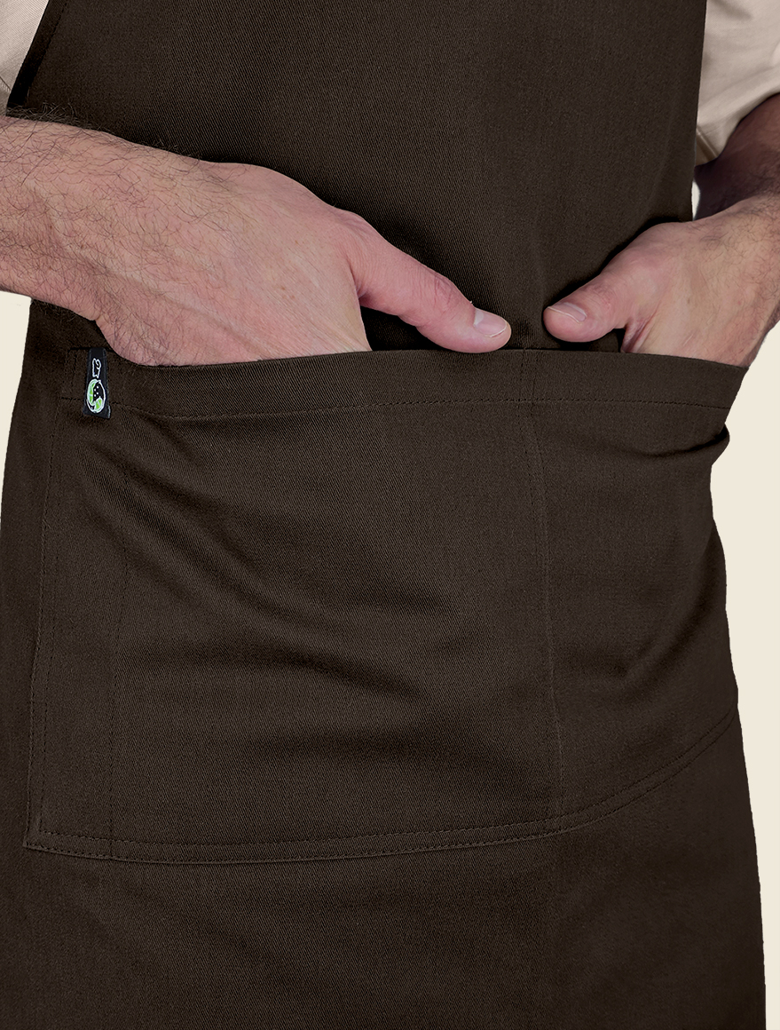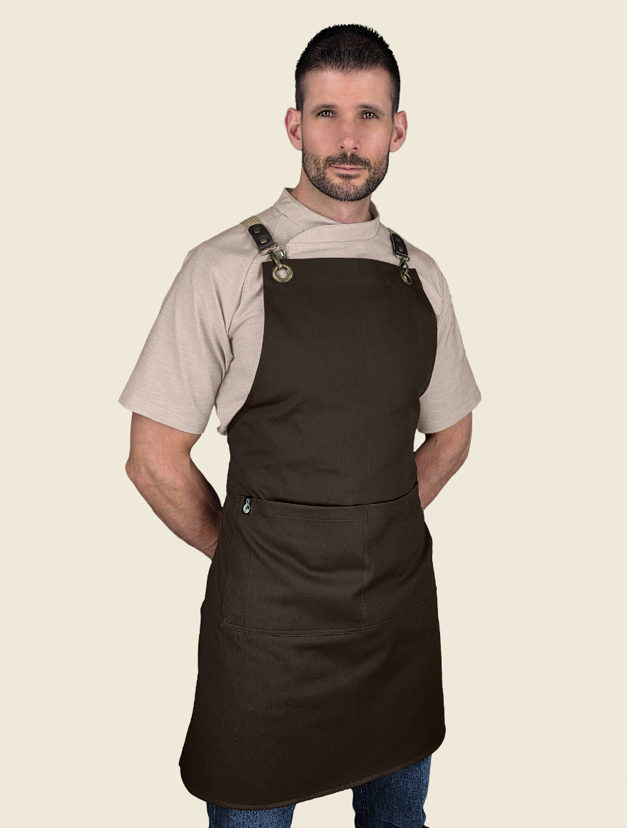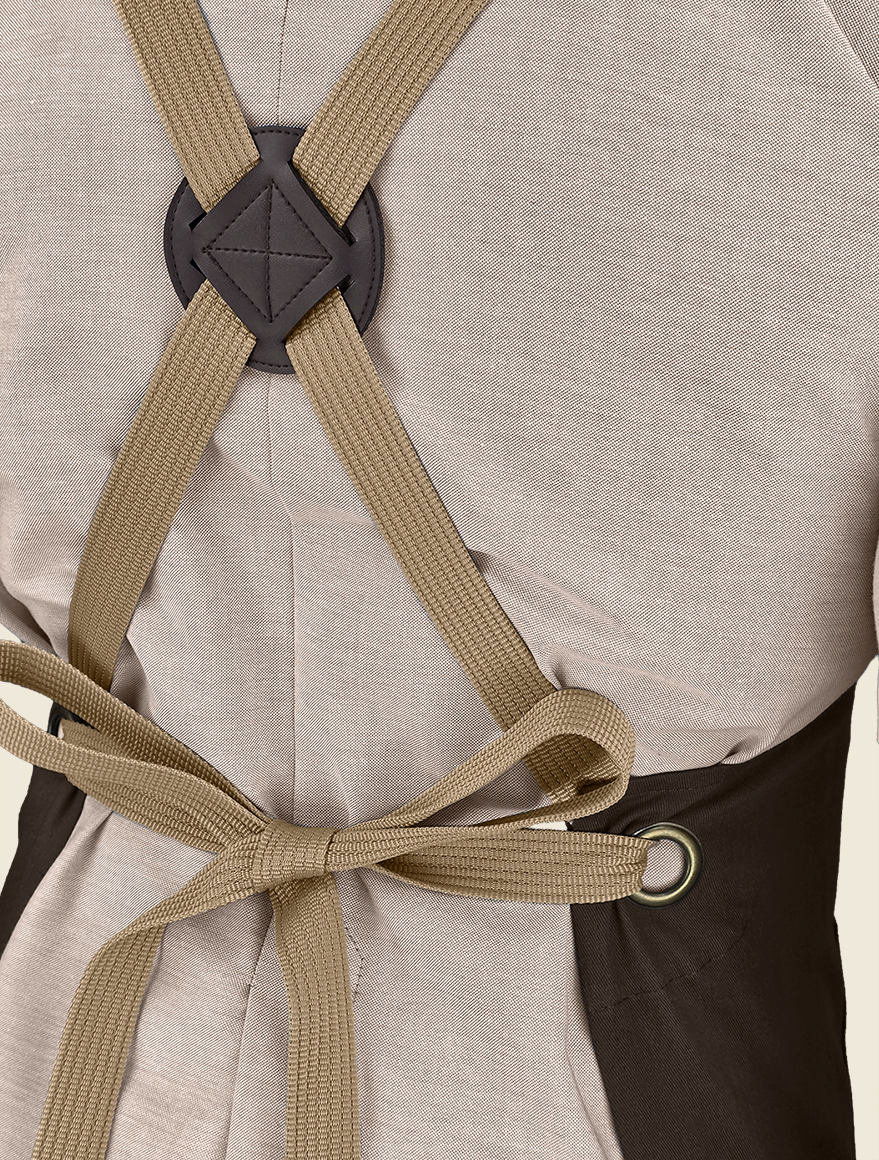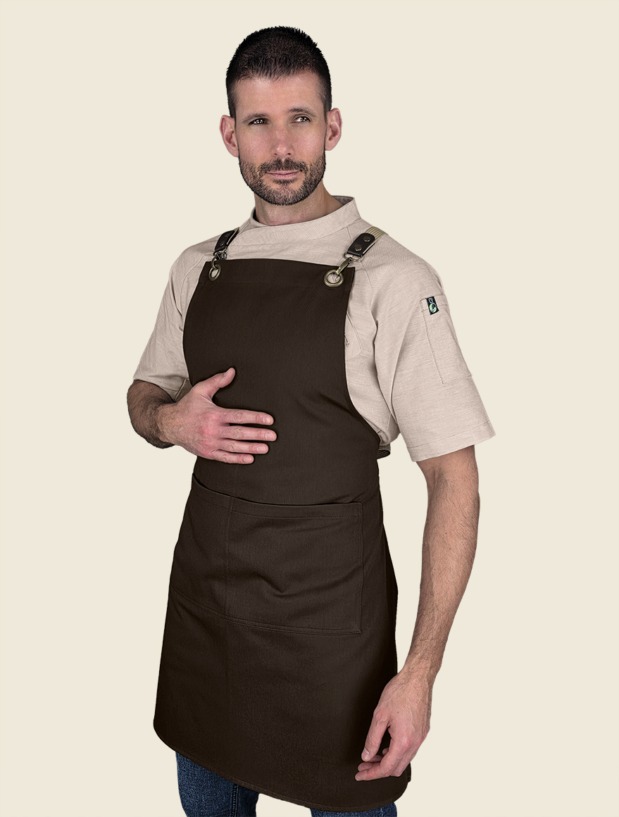 Elegante mandil de peto, 100% mexicano, con cintas ajustables cruzadas en la espalda a través de cómodo conector en “x” de vinipiel. Éstas se unen mediante elementos decorativos de vinipiel remachados a bandolas metálicas color oro viejo, conectadas a su vez al mandil a través de ojillos. Cuenta con dos prácticas bolsas tipo parche, centradas al frente, a la altura de la cadera.