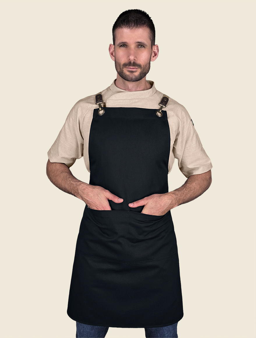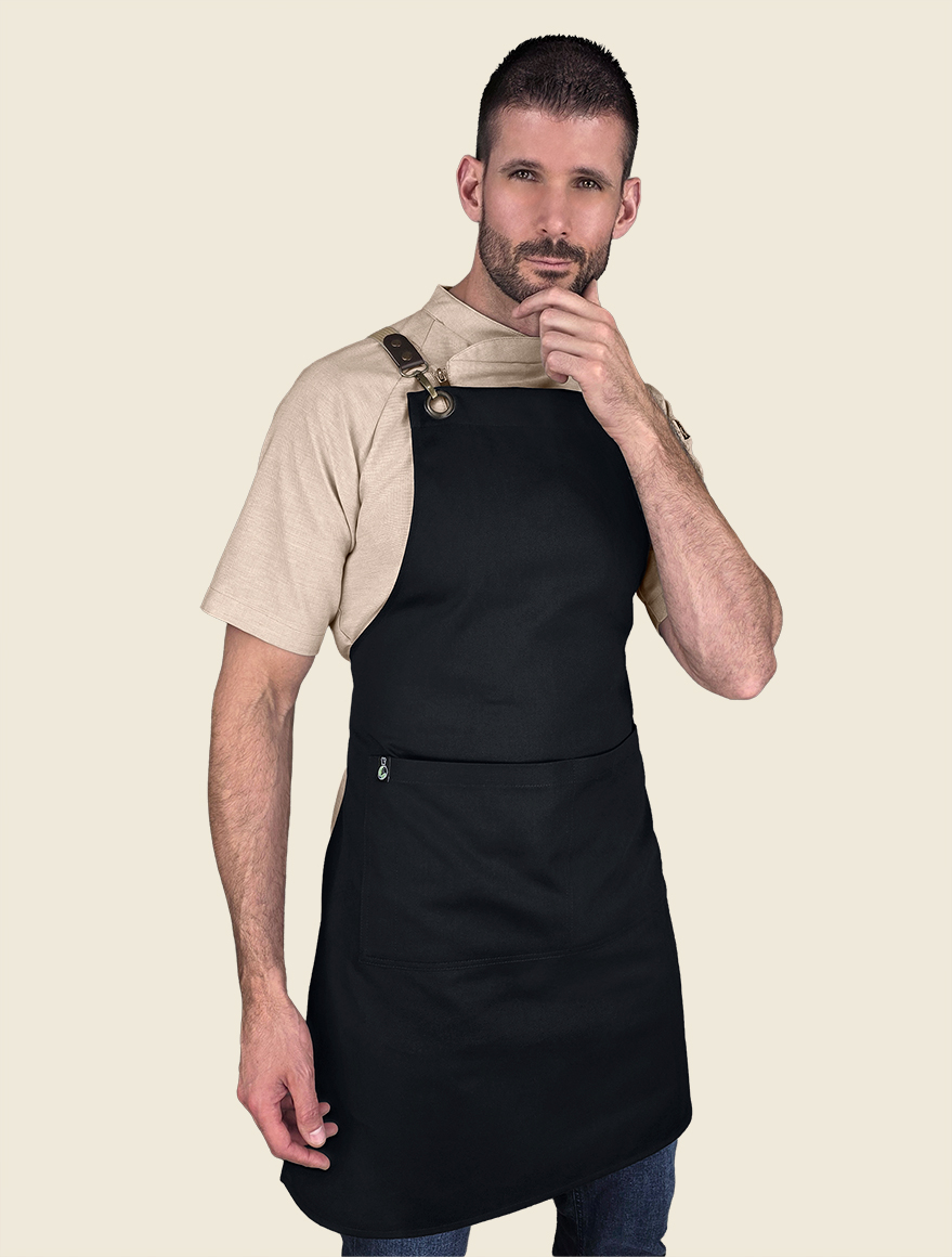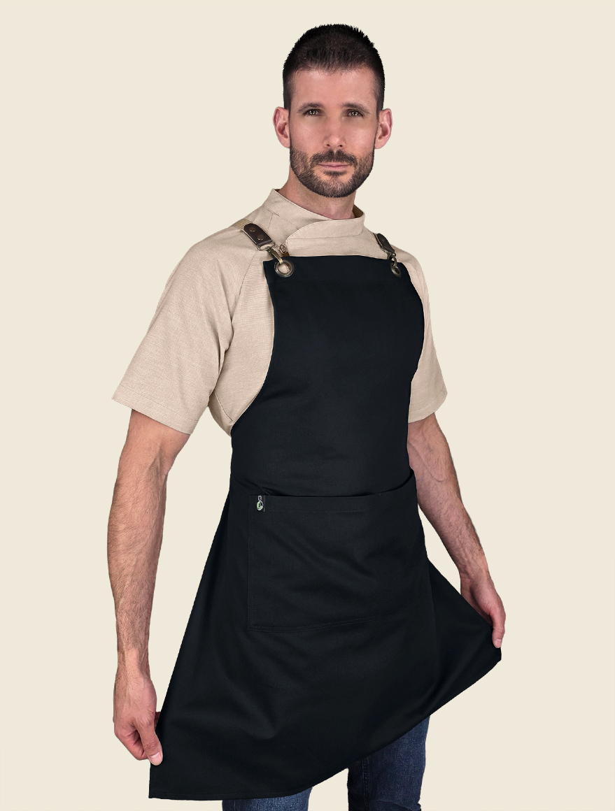 Elegante mandil de peto, 100% mexicano, con cintas ajustables cruzadas en la espalda a través de cómodo conector en “x” de vinipiel. Éstas se unen mediante elementos decorativos de vinipiel remachados a bandolas metálicas color oro viejo, conectadas a su vez al mandil a través de ojillos. Cuenta con dos prácticas bolsas tipo parche, centradas al frente, a la altura de la cadera.