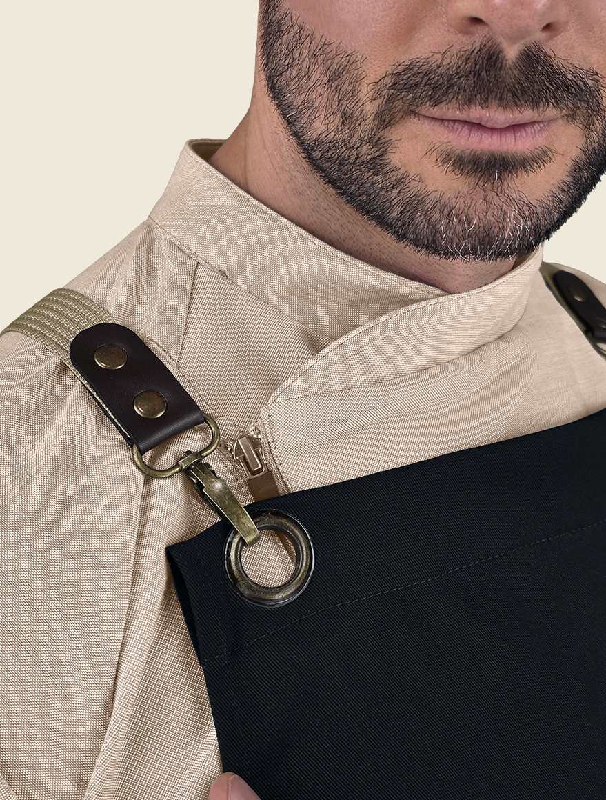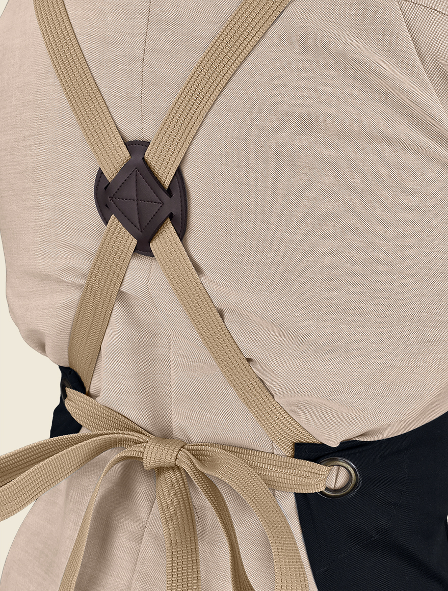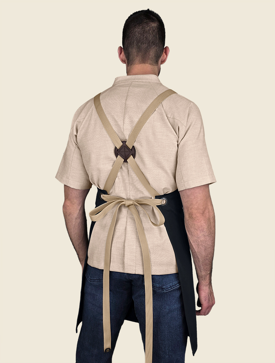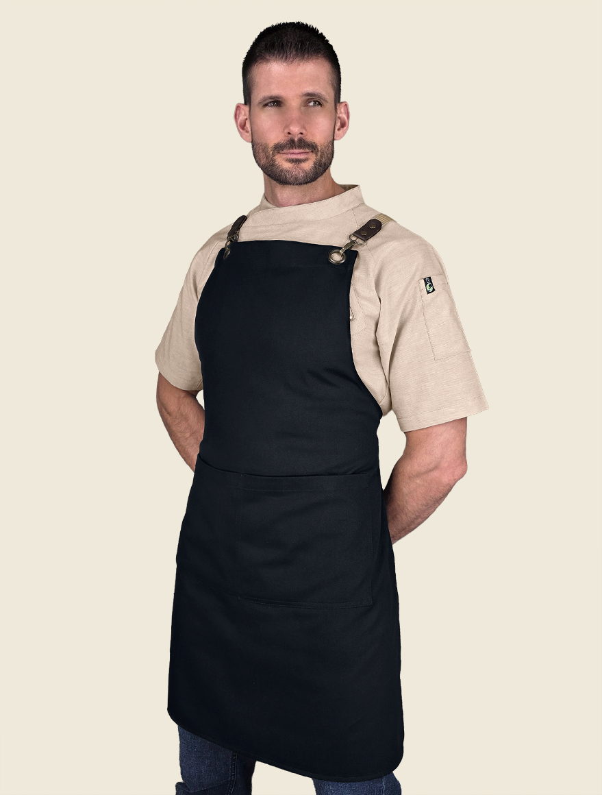 Elegante mandil de peto, 100% mexicano, con cintas ajustables cruzadas en la espalda a través de cómodo conector en “x” de vinipiel. Éstas se unen mediante elementos decorativos de vinipiel remachados a bandolas metálicas color oro viejo, conectadas a su vez al mandil a través de ojillos. Cuenta con dos prácticas bolsas tipo parche, centradas al frente, a la altura de la cadera.