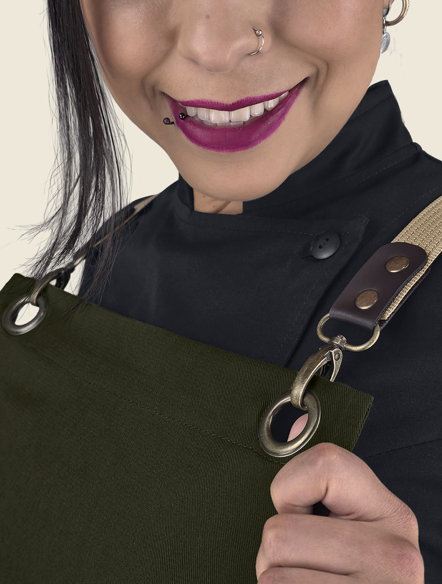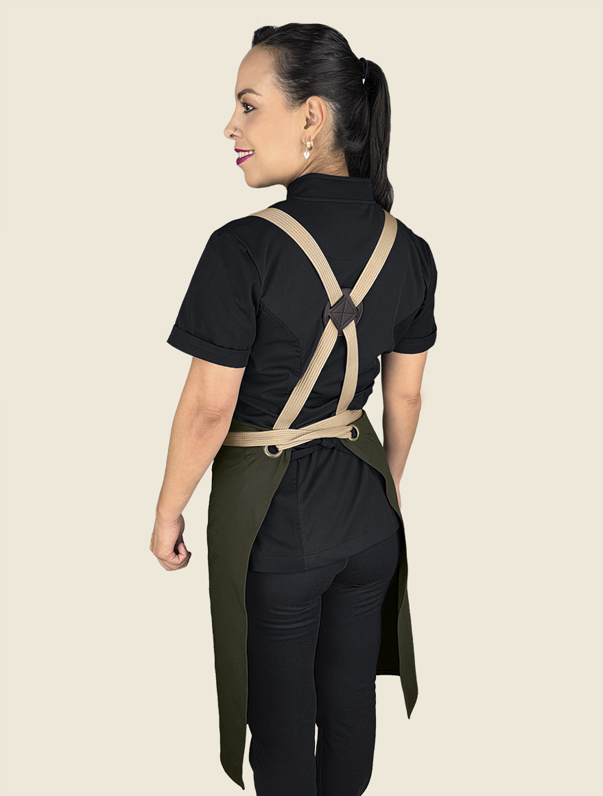 Elegante mandil de peto, 100% mexicano, con cintas ajustables cruzadas en la espalda a través de cómodo conector en “x” de vinipiel. Éstas se unen mediante elementos decorativos de vinipiel remachados a bandolas metálicas color oro viejo, conectadas a su vez al mandil a través de ojillos. Cuenta con dos prácticas bolsas tipo parche, centradas al frente, a la altura de la cadera.